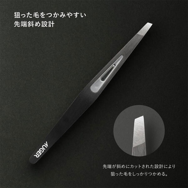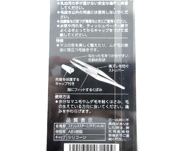 | 内 容 | ■貝印 AUGER 毛抜き(HC-2304) ■本体サイズ:96×9×14mm 毛をつかみやすいよう斜め形状にした先端が、 細かな毛まで逃さずキャッチします。 先端の横ズレを防止するストッパーと、 指の腹にフィットして繊細な 指の感覚まで先端に伝えるくぼみ形状で、 狙った毛を逃さない設計を実現しました。 |