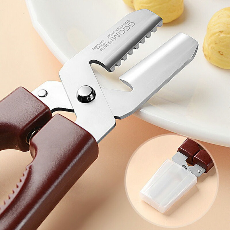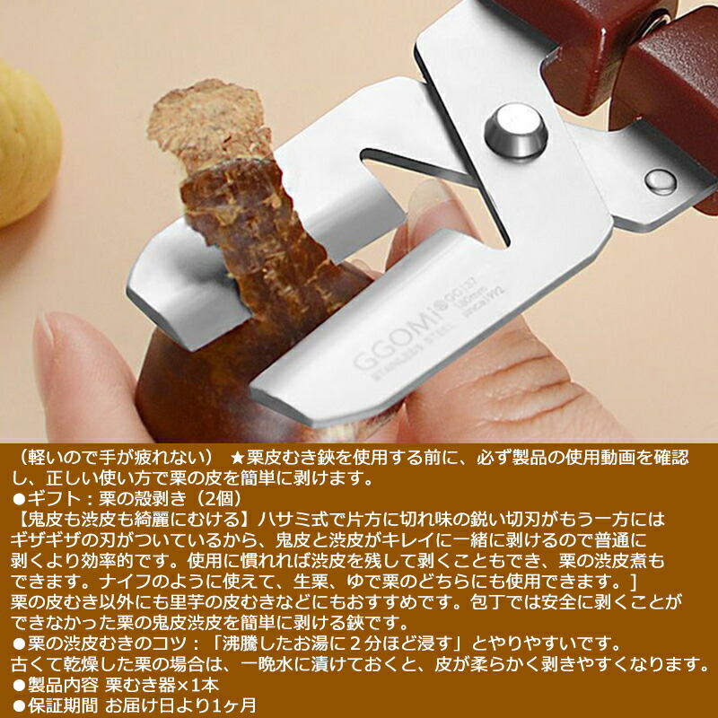 使用に慣れれば渋皮を残して剥くこともでき、栗の渋皮煮もできます。ナイフのように使えて、生栗、ゆで栗のどちらにも使用できます。栗の皮むき以外にも里芋の皮むきなどにもおすすめです。包丁では安全に剥くことができなかった栗の鬼皮渋皮を簡単に剥ける鋏です。