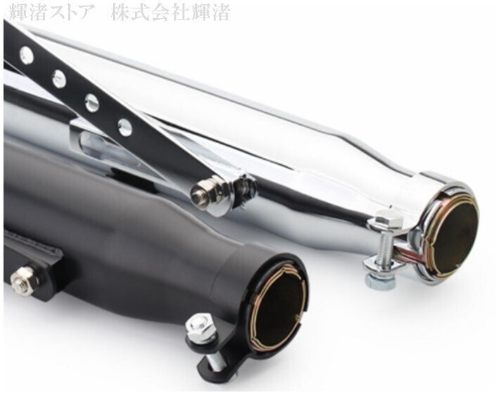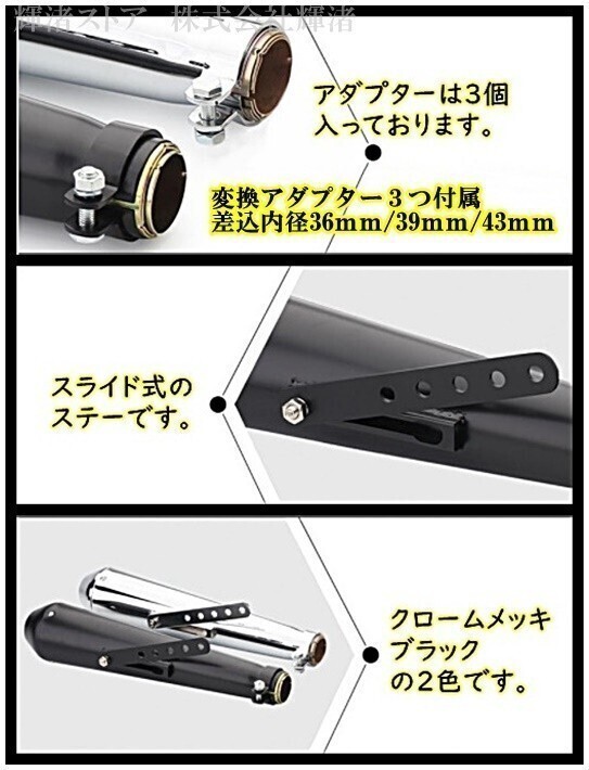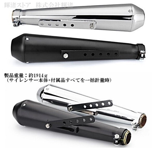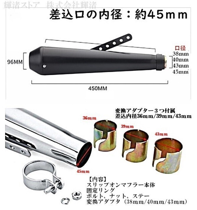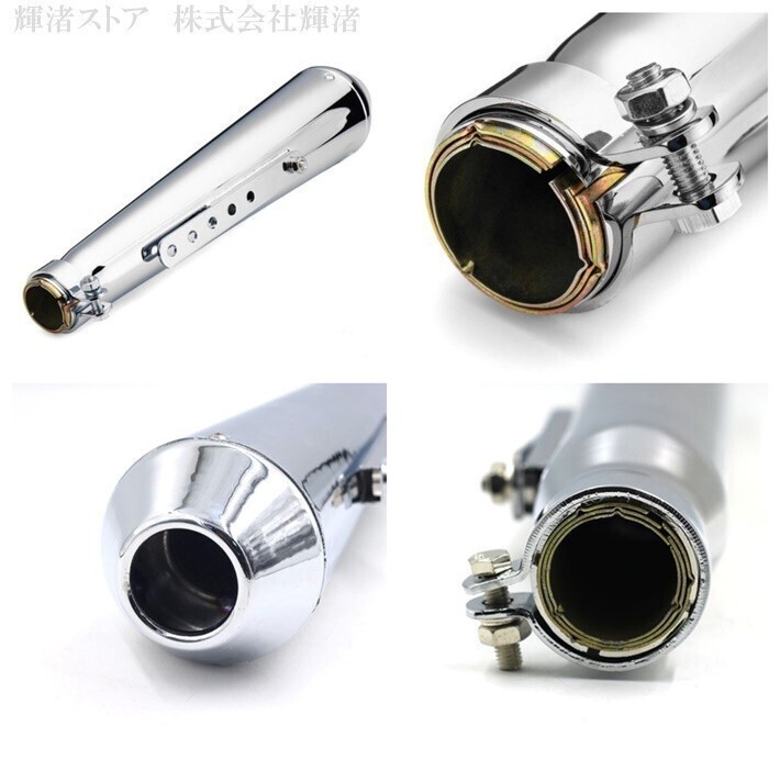 【発送方法】 日本郵便ゆうパック(提携版) (1-2営業日以内に奈良県から出荷致します。) 【カラー】 メッキ 【内容】 スリップオンマフラー本体×2本 固定リング ボルト、ナット、ステー 変換アダプター3個付属。差込内径約(36mm/39mm/43mm) 【材質】 製品の材質:鉄(スチール) 製品重量:1914g (スリップオンマフラー+付属品すべてを一括計量時) 商品側の差込口内径が 約45mmです。 【備考】 中に脱着不能のパンチングサイレンサーが入っております。 更に音量を落とされる場合には、 干渉しないサイズのインナーバッフルをご用意いただき 穴あけ 取付加工が必要です。
