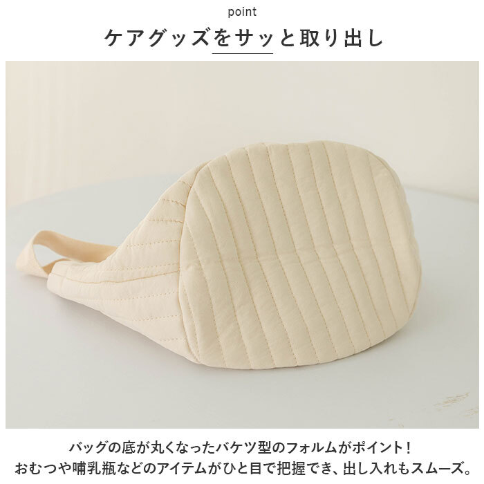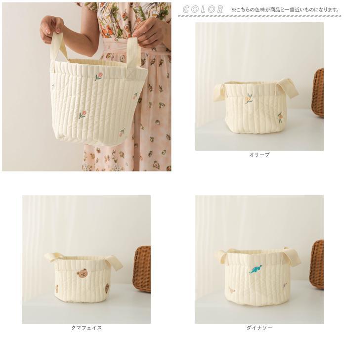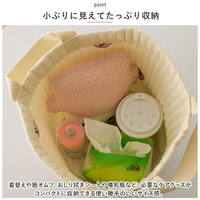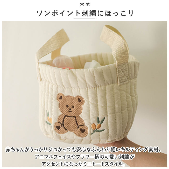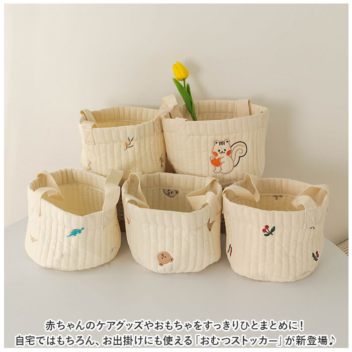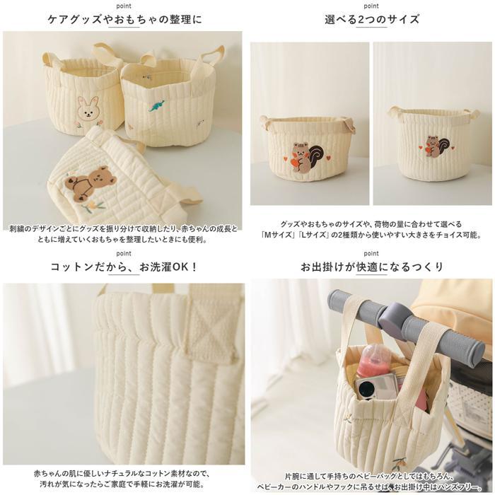 | 商品説明 | ・・赤ちゃんのケアグッズやおもちゃをすっきりひとまとめに!自宅ではもちろん、お出掛けにも使える「おむつストッカー」が新登場♪ ・【ワンポイント刺繍にほっこり】 ・赤ちゃんがうっかりぶつかっても安心なふんわり軽いキルティング素材。アニマルフェイスやフラワー柄の可愛い刺繍がアクセントになったミニトートスタイル。 ・【ケアグッズをサッと取り出し】 ・バッグの底が丸くなったバケツ型のフォルムがポイント!おむつや哺乳瓶などのアイテムがひと目で把握でき、出し入れもスムーズ。 ・【小ぶりに見えてたっぷり収納】 ・着替えや紙オムツ、おしり拭きシートや哺乳瓶など、必要なケアグッズがコンパクトに収納できる使い勝手のいいサイズ感。 ・【ケアグッズやおもちゃの整理に】 ・刺繍のデザインごとにグッズを振り分けて収納したり、赤ちゃんの成長とともに増えていくおもちゃを整理したいときにも便利。 ・【選べる2つのサイズ】 ・グッズやおもちゃのサイズや、荷物の量に合わせて選べる「Mサイズ」「Lサイズ」の2種類から使いやすい大きさをチョイス可能。 ・【コットンだから、お洗濯OK!】 ・赤ちゃんの肌に優しいナチュラルなコットン素材なので、汚れが気になったらご家庭で手軽にお洗濯が可能。 ・【お出掛けが快適になるつくり】 ・片腕に通して手持ちのベビーバッグとしてはもちろん、ベビーカーのハンドルやフックに吊るせば、お出掛け中はハンズフリー。 |