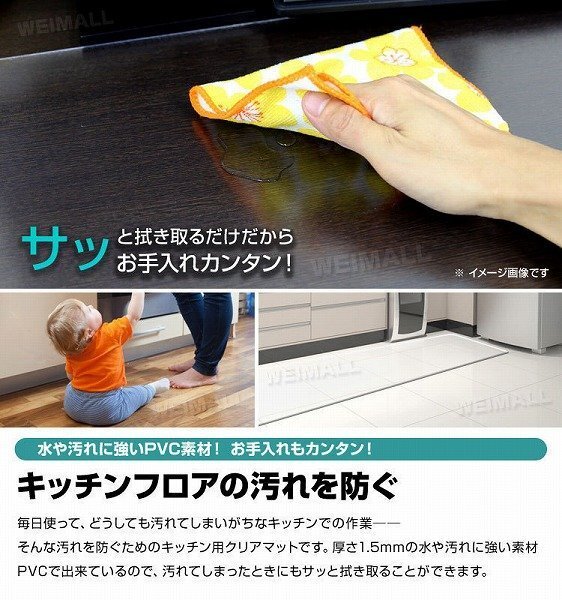 | キッチン周りの床面を傷や汚れから守るキッチンマットです。 クリアタイプなので、お部屋のイメージを損ねない!! 耐熱性があるので床暖房の上でも使用OK! 240cmの大型サイズで簡単にカットすることができるので、 ダイニングテーブルや学習机の傷防止用マットとしても最適です! 【商品仕様】 カラー:クリア サイズ(約):幅240cm×奥行60cm(厚さ1.5mm) 材質:軟質PVC 使用温度(約):−20℃〜50℃ ※お手入れは薄めた中性洗剤を湿らした布につけ、固く絞って拭いた後、 水分が残らないように乾いた布で乾拭きしてください。 ※日の当たる所で使用しないでください。日焼けで硬化する場合があります。 |