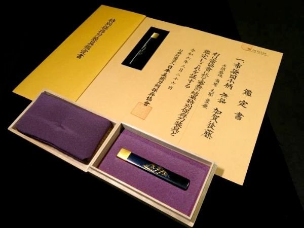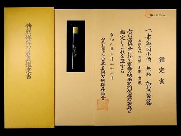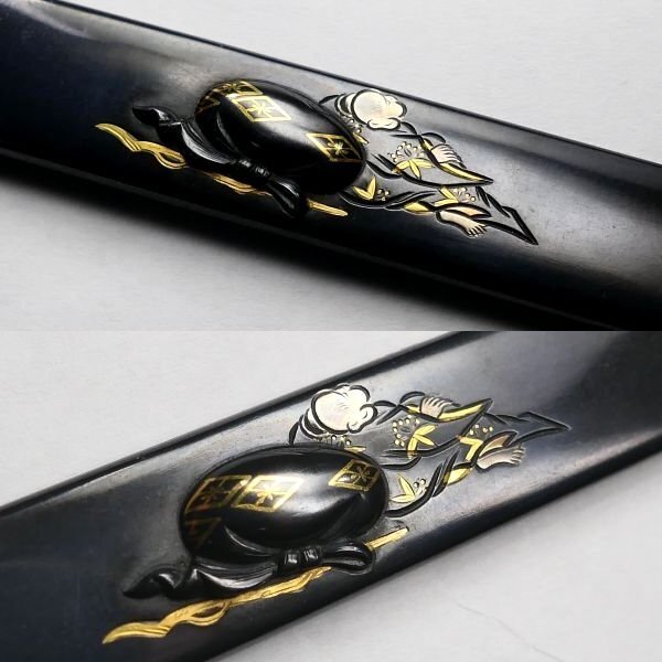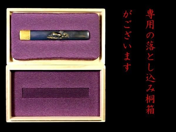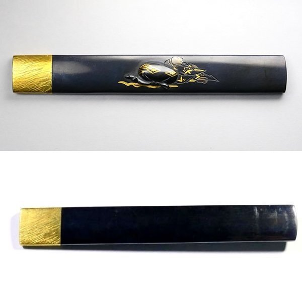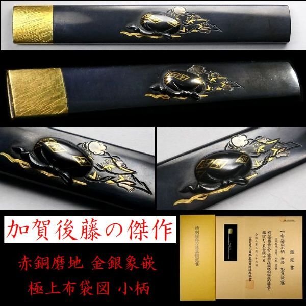 | 商品説明 | 材質・細工共に最上級の 「加賀後藤」が誇る 最高傑作小柄のご紹介です。 黒々とした極上の赤銅磨地に 抜群の金象嵌と 見事な高彫毛彫細工により 洗練された極上の布袋図の施された 最上級の金工作品でございます。 袋にもたれる布袋を背中から描写した 凝った構図の作品となっております。 この機会に是非手に入れて下さい。 【特別保存刀装具鑑定書付属】 寸法: 約 9.56cm × 約 1.35cm 時代: 江戸時代 材質: 赤銅磨地 桐箱付 銘 : 無銘 状態:特に気になる傷みはなく良好。画像にてご判断下さい。 :許容範囲内の時代傷みはご理解下さい。 |