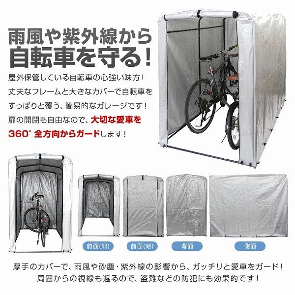 | 自転車1〜2台を収納可能! UVカット加工、撥水加工生地を採用! 大切な自転車やバイク、お荷物をホコリや雨から守ります。 目隠しになるので盗難防止効果もあり! また自転車だけでなく、農業用品、園芸資材の収納庫としてもご利用いただけます。 【商品仕様】 本体サイズ(約):幅100×奥行180×高さ160cm 重量(約):10kg 材質:スチール、ポリエステル 他 【注意事項】 ・気温の寒暖差によりサイクルハウス内が結露することがあります。 ・台風、竜巻はもちろんのこと、強風時は直ちに使用を中止し、テント生地を外してください。 風により転倒したり、風で飛ばされたりする危険があります。製品の破損や周りの建物や壁、置物、車などを傷つける恐れがあります。 ・風の影響は設置場所や気候によって大きく異なりますので、固定方法はお客様の責任で行ってください。 ・火の近くで使用しないでください。 ・地面が平らな場所でご使用ください。凸凹がある場合や斜めの場所で使用しますと転倒したり、風で飛ばされたりする危険があります。 【もちろん新品未使用品です】 ▼検索キーワード |