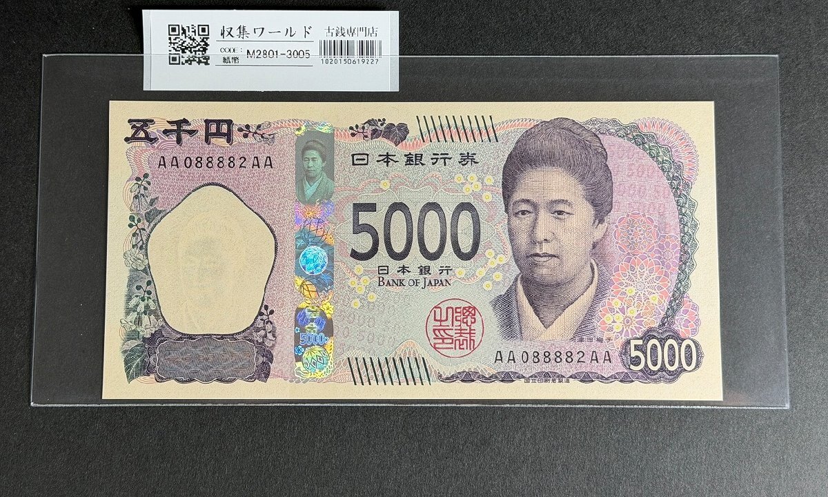 1円~津田 5000円紙幣 AA-AA券 2024年発行 AA088882AA 束札出し/完未品 収集ワールド
