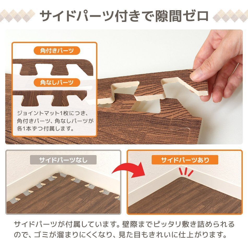 | 60cm 大判 ジョイントマットです。 カッターやはさみで簡単に切れるのでレイアウト自由自在! 足音をやわらげてくれるので、子供部屋やフローリングのお部屋に最適です! 適度なクッション性が転倒時に衝撃を和らげてくれます! 冬は床下からの冷気をカット! 夏は冷房による温度を効率よく保ちます。 汚れた部分は取り外して水洗いが出来てカンタンお手入れ♪ 嬉しい!サイドパーツ付き! 壁ぎわに敷いても、隙間なくキレイに。 掃除がラクラク!! 自然をイメージした木目デザイン! お部屋に落ち着いた雰囲気を与えてくれます! 【商品仕様】 カラー:ベージュ サイズ(約):幅60×奥行60×厚み1.0cm(※1枚) (設置目安サイズ(約):121×121cm(正方形)) 素材:PE素材 【商品内容】 ジョイントマット 64枚 サイドパーツ(角付きパーツ64本、角なしパーツ64本) ※床材との温度差で製品が反る場合があります ※入荷時期によって厚みや幅に多少の誤差がある場合がございます ※商品はモニターによって色合いが異なって見える場合があります (マット 木目 木目柄 WEIMALL WEIWEIホールディングス) |