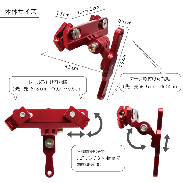 サドルレールに取り付けるボトルケージホルダー。 取付け後も各種間接で角度調整が可能なので、サドルシートに座って干渉しない角度へ調整が可能です。 フレームに取り付けるケージが少ない方や、ツールボックス用・ボトル用など、より多くケージを取付けたい方にオススメです。 真夏のライドでボトルが多く必要になる時などとても活躍します。 本体サイズ 本体サイズ 取り付け部分:幅7.2~9.2x高さ1.8x奥行1.5cm ケージ取り付け部分:幅1.3x高さ7.5x奥行0.5cm 重量:40g 取付可能サドルレール幅:(先‐先)6~8cm Φ0.7~0.6cm 角度調整可能 取付可能ケージ:穴幅(先‐先)6.9cm Φ0.4cm 固定用ツール:六角レンチ3/4mm (ツールは付属しません) | |