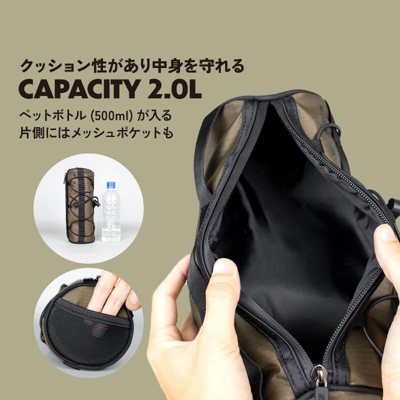 容量2.0Lで、必要なものだけをすっきり収納。スマホ、ポーチ、鍵などを持ち運ぶのに最適。