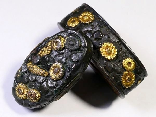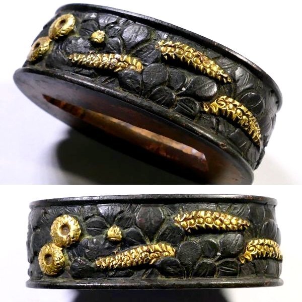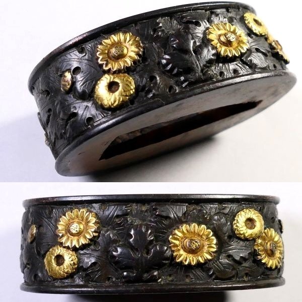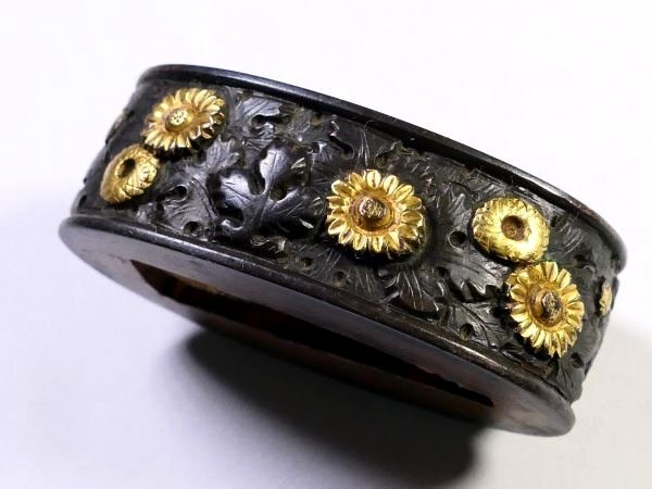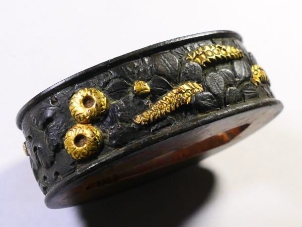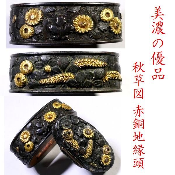 | 商品説明 | 黒々とした上質な赤銅地に 金色華やかな色絵としっかりとした彫りにより 見栄え良きの秋草図が施された 拵栄えする一品です。 作行から見て 「美濃」の優品と推測しております。 詳しくは画像にてご確認下さい。 観賞用にも拵用にも 幅広く活躍する一品と存じます。 この機会に是非手に入れて下さい。 【上質な赤銅地】 【華やかな金色絵】 【拵栄えする一品】 寸法: (縁) 約 3.78cm × 約 2.26cm × 約 1.24cm (厚み) (頭) 約 3.31cm × 約 1.78cm × 約 0.72cm (厚み) 時代: 江戸時代 材質: 赤銅地 銘 : 無銘 状態:特に気になる傷みはなく良好。画像にてご判断下さい。 :許容範囲内の時代傷みはご理解下さい。 |