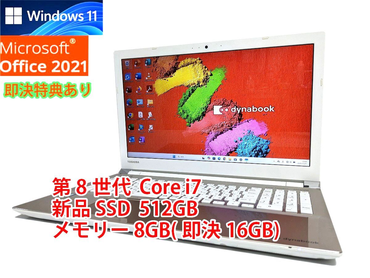 即決特典 ・即決価格で落札された場合、無料でメモリの容量を8GBから16GBにアップグレードいたします。 領収書について ・適格領収書(インボイス)の発行が可能です。 ※ご希望の場合は落札後に取引ナビにてお申しつけください。 オプション [オプション1] :落札金額プラス4500円でメモリーの容量を8GBから16GBにアップグレードいたします。 [オプション2] :落札金額プラス5500円でSSDの容量を512GBから1TBにアップグレードいたします。 [オプション3] :落札金額プラス10000円でメモリーの容量を8GBから16GBに、SSDの容量を512GBから1TBアップグレードいたします。 ※ご希望の場合は落札後決済前に取引ナビにてお申しつけください。 商品メーカー:東芝 モデル、型名:dynabook T65/HG OS:Windows11 pro 25H2 液晶: 15.6型ワイド 1920×1080ドット CPU:インテル Core i7 8550U プロセッサー 1.80GHz (ターボブースト最大 4.00GHz) メモリ:8GB(即決落札の場合16GBに無料でアップグレードいたします) ストレージ:新品SSD 512GB USB:USB3.0×2、USB2.0×2 光学式ドライブ:DVDスーパーマルチドライブ 無線LAN:搭載 有線LANポート:搭載 バッテリー:30分駆動を確認いたしました(デスクトップ待ち受け時の確認です) インターフェイス:SDカードスロット HDMI端子 Webカメラ Bluetooth 付属品:ACアダプター クリーニング済みです。パソコン到着後、すぐにお使いいただけます。 Windows11 pro (64bit)をすぐにお使い頂けるようセッティングしております。 動作確認、メンテナンス、設定済みです。 USBポート、キーボード、タッチパッド、有線LAN、無線LAN、光学ドライブ、WEBカメラ、HDMI 上記の動作確認チェックをしております。 WEBカメラ搭載 WEBカメラ搭載ですので、テレビ会議、テレワークに最適です。 最新のMicrosoft Office Professional Plus 2021 を搭載 (正規認証済み) ※サブスクリプション版ではなく永久版です。 Word・Excel・PowerPoint・Outlook・Onenote・Publisherといった Microsoft Officeに含まれるソフトで作成したファイルを開き、編集できます。 超高速起動・大容量・省電力の新品SSDを搭載 データ処理速度、堅牢性、省電力性能などにおいてHDDに比べ段違いなパフォーマンスを発揮します。 セキュリティソフト Windows Defender 搭載 Windows Defenderとはマイクロソフト社が開発・提供しているセキュリティソフトです。 Windows11には標準でインストールされております。 Windows Defenderだけでマルウェア対策は十分です。新たにセキュリティソフトをインストールする必要はありません。 リカバリー領域作成済み SSD内にリカバリー領域を作成しております。 何かあった際、すぐに購入時の状態へリカバリーできます。 便利なソフトをプリインストール済み メディア再生ソフト VLC media player、Leawo Blu-ray Player はがき作成ソフト 筆ぐるめ32、筆まめ35ベーシック、はがき作家 ブラウザソフト Google Chrome、Firefox | |||