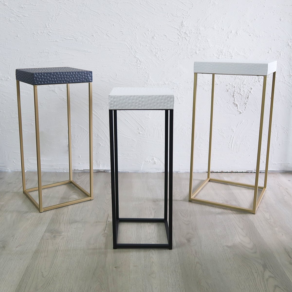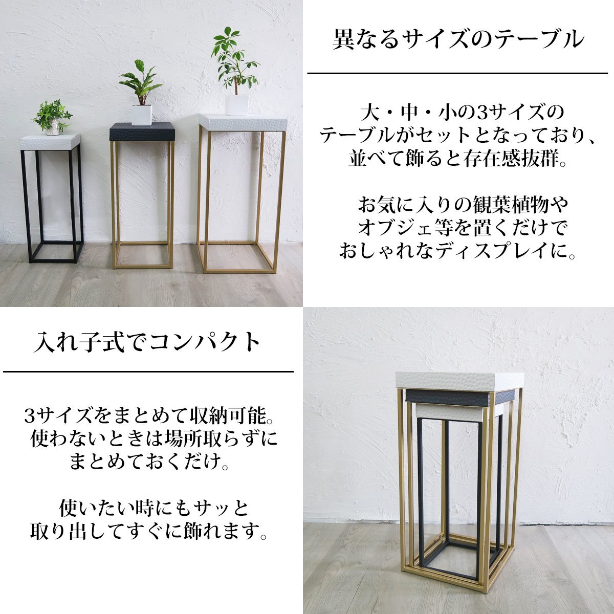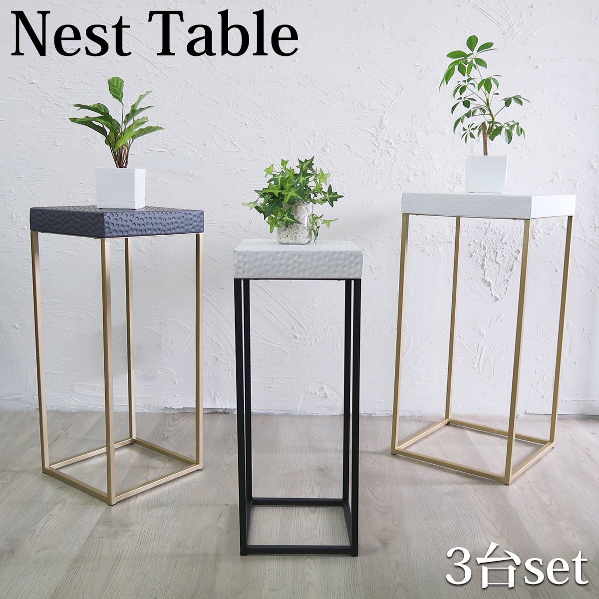 ![]() シンプル×モダンの融合。 アイアン製のモダンなネストテーブル3台セットです。 クラシカルなデザインのトップやスリムなフレームが素敵。 一見シンプルに見える中にも アクセントを付ける事でお部屋に彩りを持たせます。 入れ子式なので3台まとめて収納可能! 使わない時にはサッと一つにまとめてしまっておけます。 それぞれサイズの違うテーブルを並べて飾ればインパクト抜群! コンパクトなサイズ感でスッキリとしたシルエットなので 場所を取らずに圧迫感も無く飾れます。 ソファ横、ベッドサイド、リビング等に置いてワンランク上のおしゃれな小物置きに。 高級感あふれるデザインが視覚的な楽しみも与えてくれるオブジェとしても楽しめます。 お気に入りの小物を楽しく、おしゃれにディスプレイ可能。 観葉植物などを飾るプランタースタンドとしても大活躍! 商品仕様 サイズ(約):画像をご参照ください。 重量(約): Sサイズ:1.9kg Mサイズ:1.9kg Lサイズ:2.2kg 材質:鉄 |
