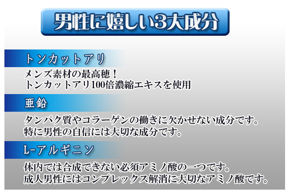 | 【主要成分】 | L-アルギニン300㎎、トンカットアリエキス末(100:1)50㎎、亜鉛50㎎ (1カプセル400mg中) |