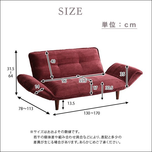 | 【サイズ】 W130~170xD78~113xH31.5~64cm 【重量】 15kg 【梱包】 サイズ:125x50x63cm、重量:16kg 【カラー】 ベージュ、ブラウン、グリーン、ネイビー、レッド、イエロー 【素材】 生地:ポリエステル 91%、レーヨン 9% 構造部材:スチールパイプ、ポケットコイルスプリング 脚:樹脂脚 中身:ウレタンフォーム 【その他】 カバーは取り外し不可 日本製(カバーは中国製) 【完成品】 脚のみ取り付け。 【ご注意】 ・サイズ、重量は概算です。 ・商品カラーはご使用のモニターによって実際の明るさや色と異なって見える場合がございます。 |