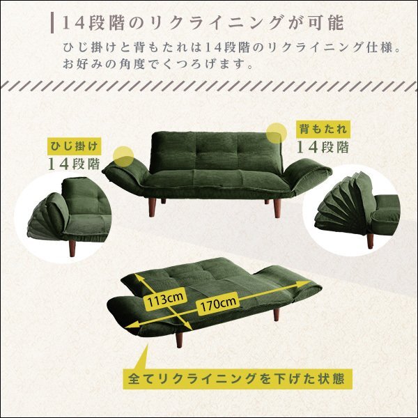 | 【ポイント】 コーデュロイ生地で肌触りが気持ちい2人掛けコンパクトソファです。 背もたれ、肘置き部分は14段階リクライニング可能なのでベストな位置に調整できます。 ポケットコイル搭載で耐久性GOOD! |