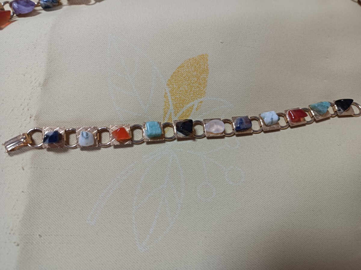 いろいろな貴石 天然石 組み合わせたネックレス ブレスレットと組み合わせて ロングネックレスにもなります。台は 金色です。 大きなダメージなく美品です。