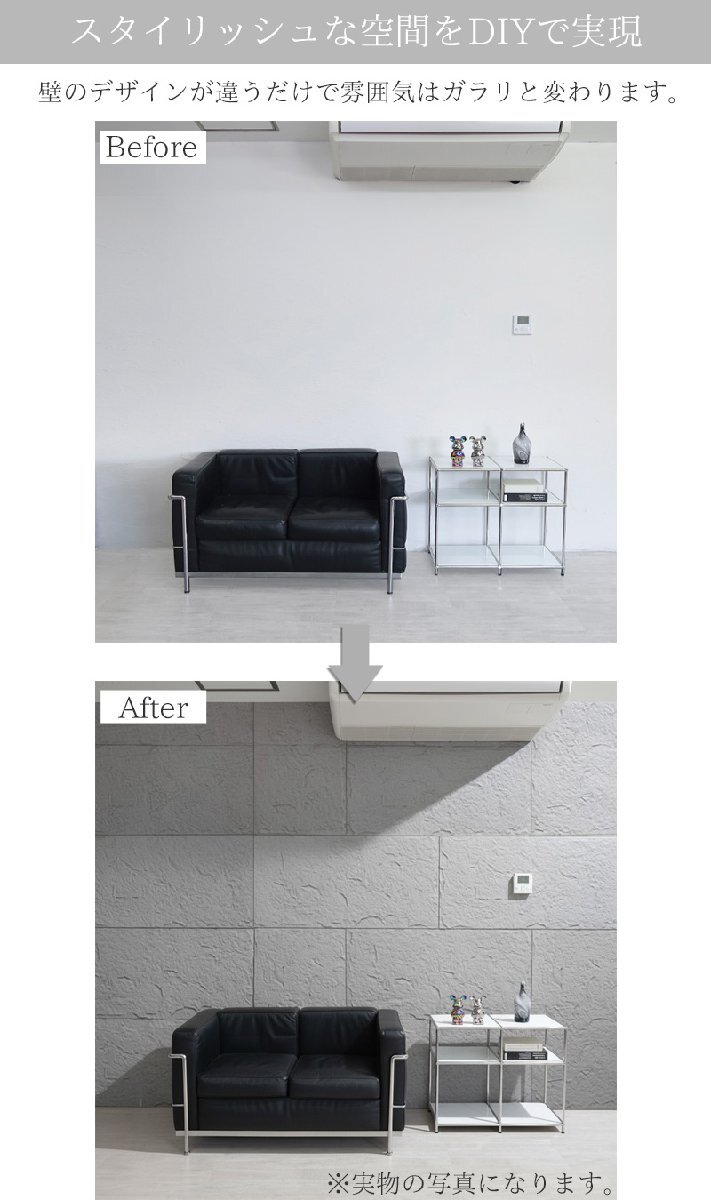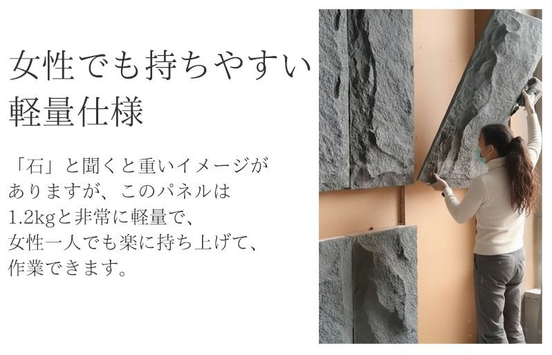 遠くから見ても、近くで見ても、思わず触れてみたくなるリアルな質感を再現! ポリウレタン樹脂は軽量で強度があることで知られており、重量を加えることなく天然石の質感を再現できます。 また、湿気、火、一般的な摩耗にも耐性があり、長期間の使用に適し耐久性があります。 室内施工なら約15年、長期間ご使用できます。 ノコギリや大型カッターナイフ、電動ノコギリなどで簡単にカット出来ます。 DIYや、リノベーション、リフォームはもちろん、 お店(店舗)の改修、改装(リニューアル)や新規オープンなどにもご利用頂けます。 ■商品詳細 商品内容:2枚セット カラー:ライトグレー サイズ:高さ120cm、横幅60cm、奥行1.6cm 面積:1.44平米( 0.436坪 ) 重量:1枚あたり1.2kg 材質:ポリウレタン |
