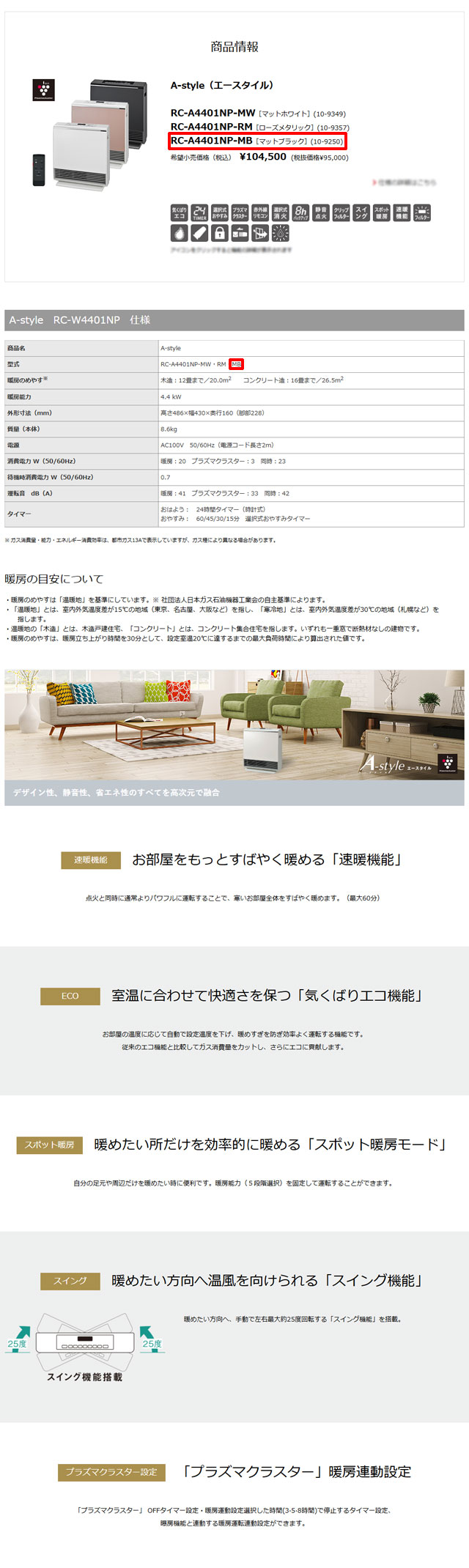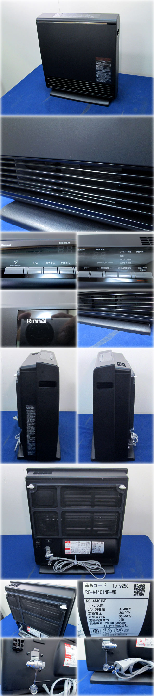 リンナイ プラズマクラスターイオン機能付ガスファンヒーター A-Style RC-A4401NP-MB を出品いたします。 ■特徴■ デザイン性、静音性、省エネ性の すべてを高次元で融合 お部屋をもっとすばやく暖める「速暖機能」 点火と同時に通常よりパワフルに運転することで、 寒いお部屋全体をすばやく暖めます。 (最大60分) 室温に合わせて快適さを保つ「気くばりエコ機能」 お部屋の温度に応じて自動で設定温度を下げ、 暖めすぎを防ぎ効率よく運転する機能です。 従来のエコ機能と比較してガス消費量をカットし、 さらにエコに貢献します。 暖めたい所だけを効率的に暖める「スポット暖房モード」 自分の足元や周辺だけを暖めたい時に便利です。 暖房能力(5段階選択)を固定して運転することができます。 暖めたい方向へ温風を向けられる「スイング機能」 暖めたい方向へ、 手動で左右最大約25度回転する「スイング機能」を搭載。 「プラズマクラスター」暖房連動設定 「プラズマクラスター」 OFFタイマー設定・ 暖房運動設定選択した時間(3・5・8時間)で 停止するタイマー設定、 曝房機能と連動する暖房運転連動設定ができます。 ■仕様■