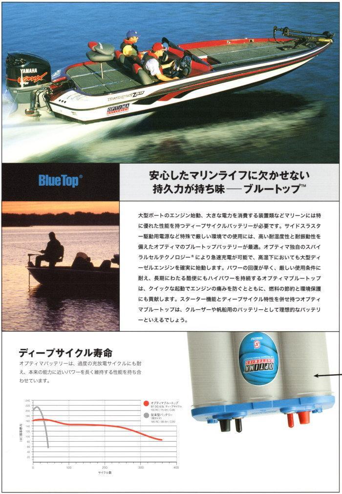 | ブルートップバッテリーは、イエロートップとおなじディープサイクルバッテリーで構造、性能は同じです。上記イエロートップの説明を参照下さい。違いはマリン用に使いやすいように予備端子が付いているの点です。 | |||||||||||||||||||||||||||||||||||||||||||