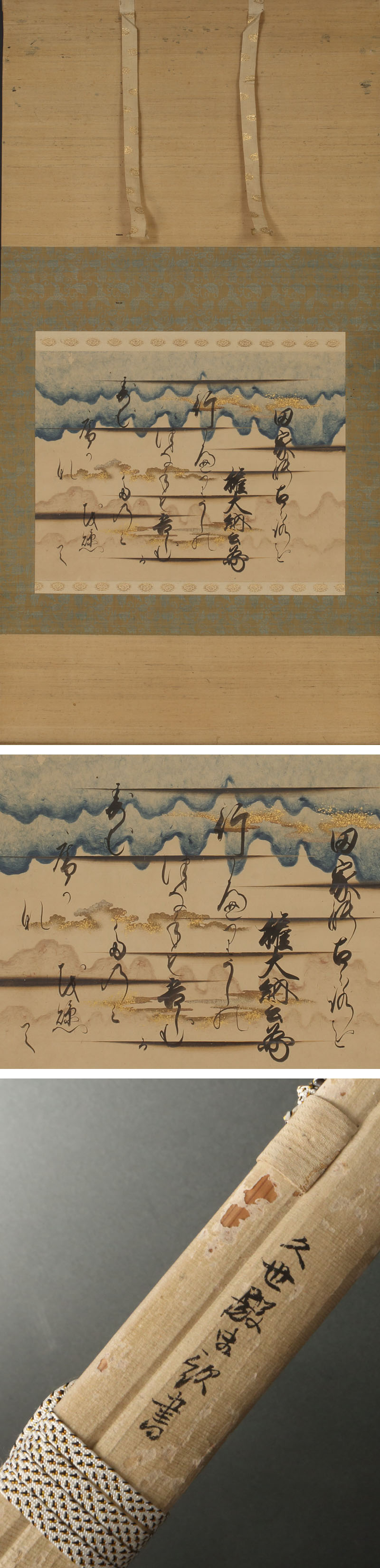 久世通理の和歌詠草です。 「田家のこゝろを」と題し、「行かへり牛の綱手も吾しむる たのみを懸てすむ庵かな」と詠んでおります。位署より、通理が権大納言であった弘化4(1847)年8月~翌年1月の書と見られます。通理66歳の書です。 上の句の「牛の綱手」は田植の様子、下の句の「たのみを懸て」は八朔の風習を詠んでおり、「綱手」と「田」のそれぞれ縁語である「しむる(締むる・占むる)」で掛詞となる、春秋の推移が詠まれた中々に技巧的な構造といえるでしょう。有栖川流の書も見事な逸品です。 ◆久世通理 江戸後期の公卿。通根の子。姓は源、法号は祥雲院。正二位・権大納言に進む。和歌を能くする。嘉永3(1850)年没、69歳。 寸法:高さ119cm、幅60cm(最大幅。若干の誤差はご了承下さい) 状態:経年のイタミがございます。 |