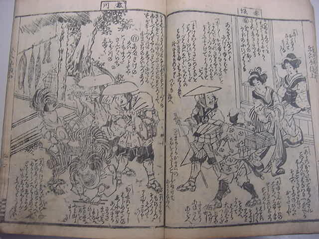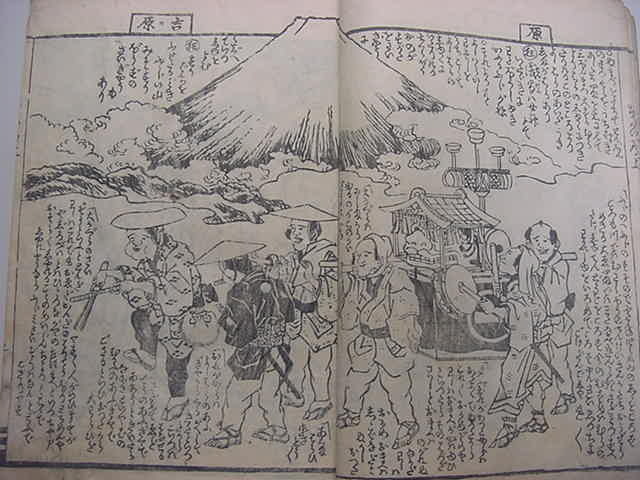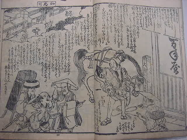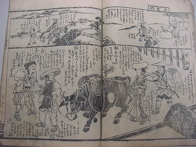 文化10年(1813)に刊行された木版オリジナル和本『金草鞋 東海道之記』全1冊です。江戸から京都へ、東海道中の宿場図などの素晴らしい浮世絵が多数挿入されたスグレモノです。見世物小屋など喜多川月麿による浮世絵がスゴイです。中本・絵題箋スレ。中の保存状態も概ねよい方です。まず市場では見ることのない十返舎一九の道中絵本をお見逃しなく!