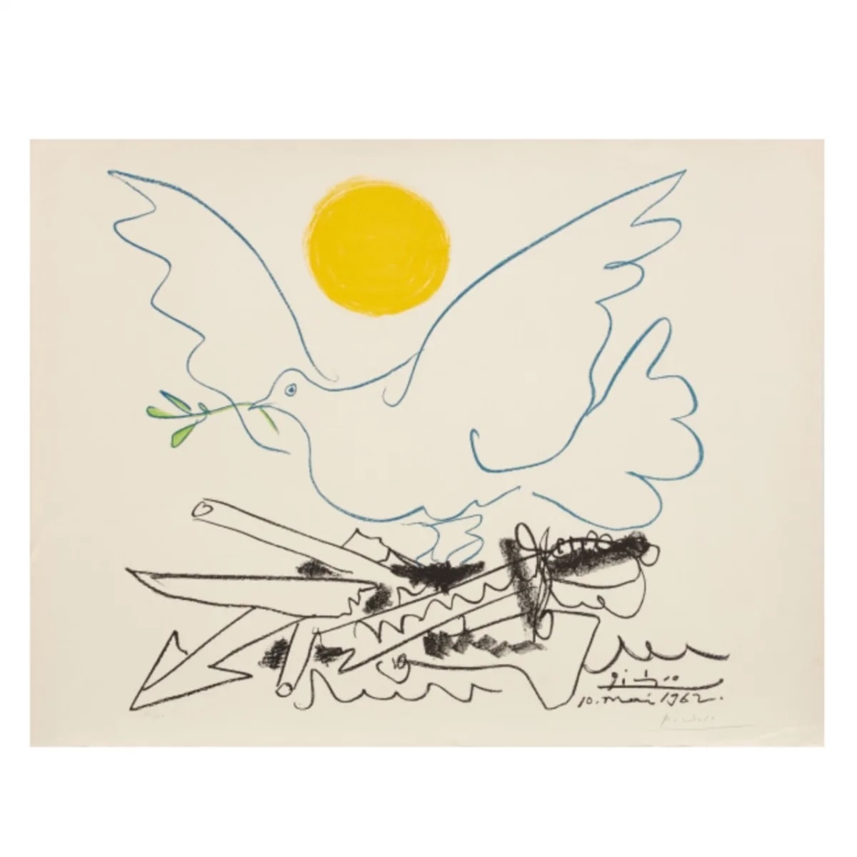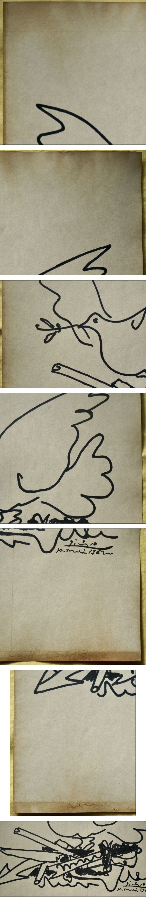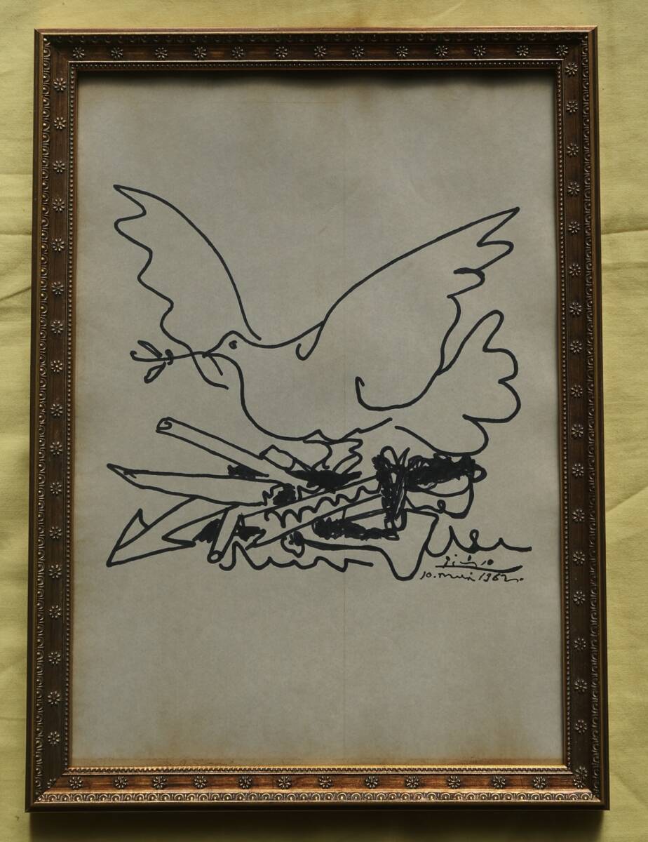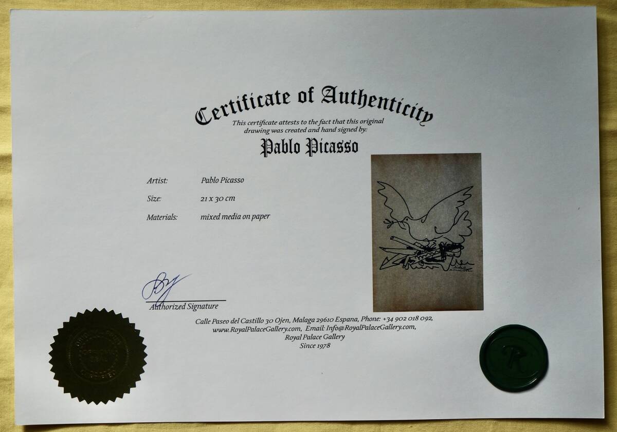 | 商品説明 | パブロ・ピカソのミクストメデイア(水彩、インク)/紙の肉筆原画です。1962年発表のリトグラフ作品「Dove with Sun(鳩と太陽)」(写真参照)に向けて描いた原作の1つと思われます。捨てられた武器の上を羽ばたく鳩を描き、ピカソの強い平和の願望を示した作品です。リトグラフ作品では太陽が描かれていますが、この原画には描かれていません。右下にサインと制作年が書かれています。ご覧のように経年により四辺を中心にヤケがあります。スペイン、マラガの老舗画廊「Royal Palace Gallery(王室宮殿画廊、1978年創立)」の証明書があり、作品は真作であることを示しています。 制作年:1962年 サイズ:約21 x 30cm 額縁:新品、約32 x 23cm、UVカットアクリル付き <注意事項>**必ずお読みください。下記の事項に同意された方のみ入札してください。** |
