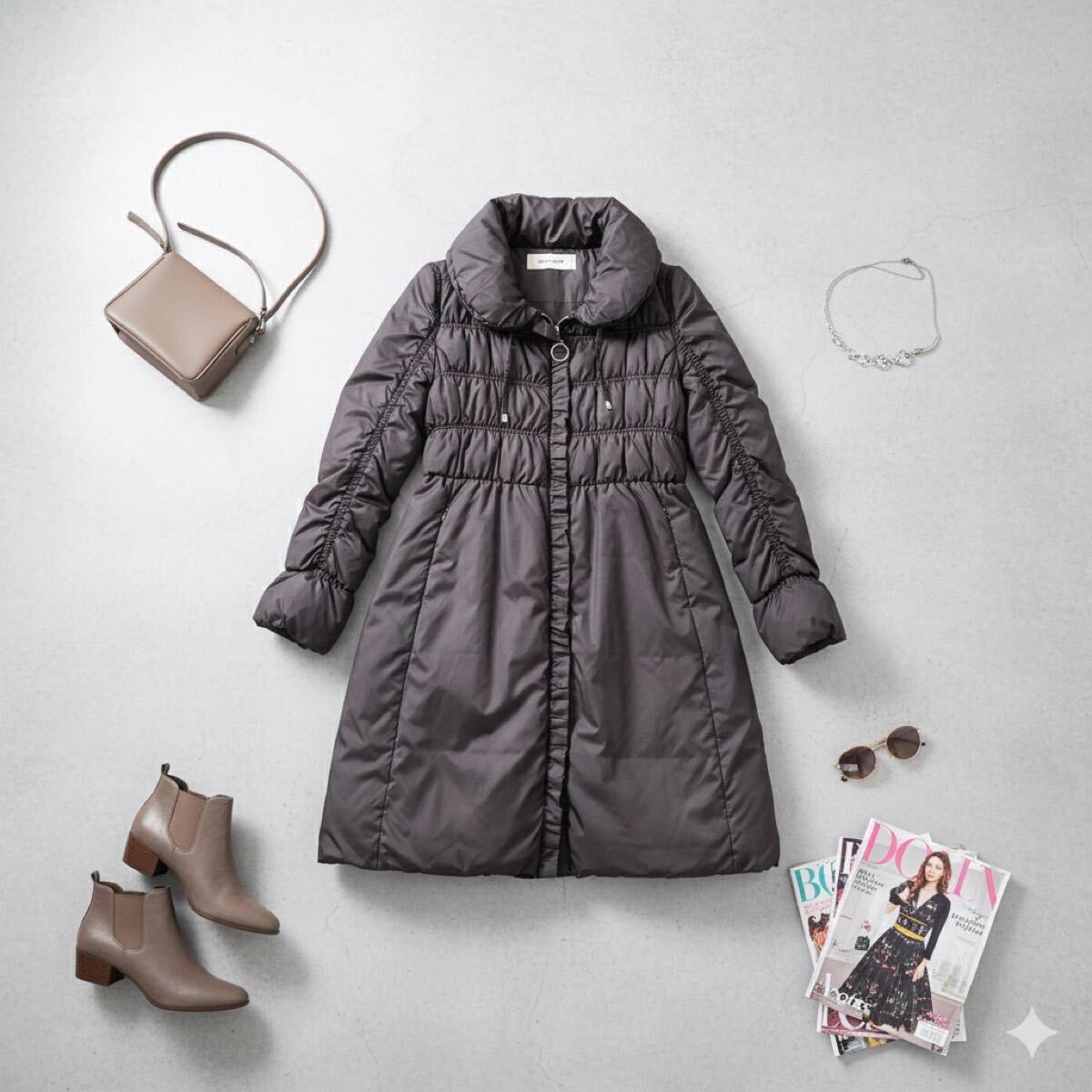 | ご覧いただきありがとうございます。 【ルネートル】ではリサイクル品を多数出品中です。ぜひご覧ください♪ 【商品名】ダウンコート 【カラー】ブラック 【サイズ】 表記:38 (Mサイズ相当) 肩幅:約38cm 身幅:約46cm 着丈:約95cm 袖丈:約64cm ※平置き採寸です。多少の誤差はご了承ください。 【特徴】 フランスの老舗ブランド、pierre cardin(ピエール・カルダン)の着るだけで主役になれるエレガントなダウンコートです。 ダウンコート特有の着膨れ感を一切感じさせない、計算され尽くした美しいシルエットが最大の魅力。ウエストとアーム部分にたっぷりと施されたシャーリングが、女性らしいくびれと立体感を演出し、まるでドレスを纏っているかのような優雅なAラインを描き出します。 顔周りを華やかに、そしてすっきりと見せてくれるボリュームたっぷりの襟は、デザイン性だけでなく、マフラー要らずの暖かさも兼ね備えた実用的なデザイン。フロントのリング状のジッパーチャームが、さりげなくブランドの品格を物語ります。 中わたには、保温性に優れたダウンを80%も使用しており、空気をまとっているかのような軽やかさと、真冬の寒さからもしっかりと体を守ってくれる確かな暖かさを両立。上品な光沢を放つシックなブラックの生地が、装いを一層リッチに引き立てます。 パンツスタイルで颯爽と、ワンピースやスカートに合わせてフェミニンに。羽織るだけでコーディネートを格上げしてくれる、冬のワードローブに欠かせない一着です。 【状態】中古品 目立つ傷や汚れはなく、まだまだ気持ちよくご着用いただけるコンディションです。 【素材】 表地:ポリエステル 100% 中わた:ダウン 80%、フェザー 20% 裏地:ポリエステル 100% | |||