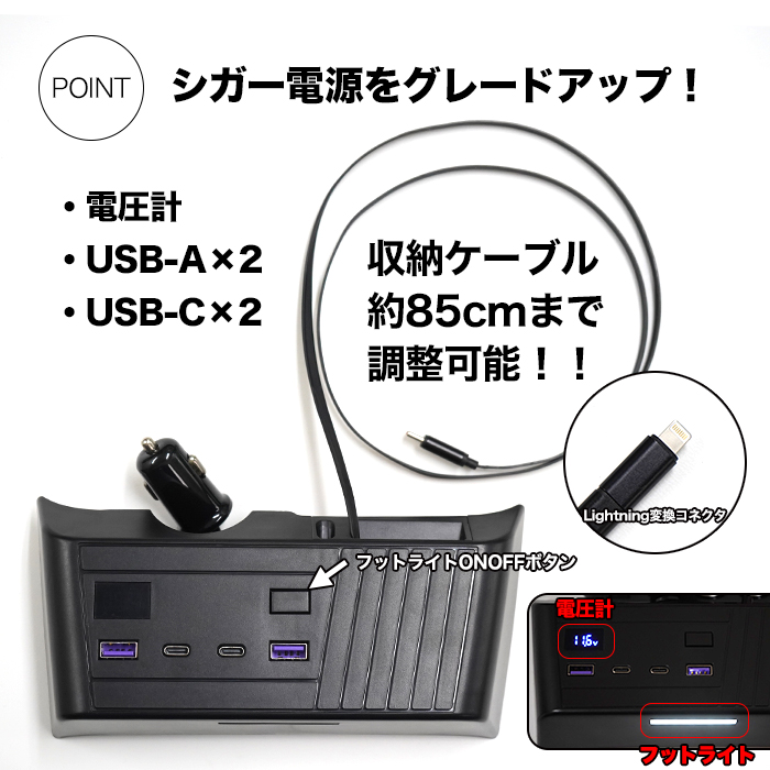 | スペーシア専用設計でピッタリフィット!! 取付も超簡単!貼り付けとシガーソケットに差し込むだけ! 電圧計付きでフットライトのLED照明付き! ライトニング変換アダプター付きでロール式のタイプCに加えて Type-C PDポート2口、USBポート2口を搭載!! ■適合車種 【スズキ車】 ・スペーシア / スペーシアカスタム 適合型式:MK54S / MK94S 適合年式:2023年11月(令和5年11月)~ 【マツダ車】 ・フレアワゴン / フレアワゴンカスタムスタイル 適合型式:MM54S / MM94S 適合年式:2023年12月(令和5年12月)? ■仕様 ・タイプA(QC3.0)× 2 ・タイプC(PD)× 2 ・ロール式Type-C ケーブル × 1 ・電圧計 ・フットライト ■カラー:ブラック ■セット内容 ・電源増設ユニット × 1 ・ライトニング変換アダプター × 1 |