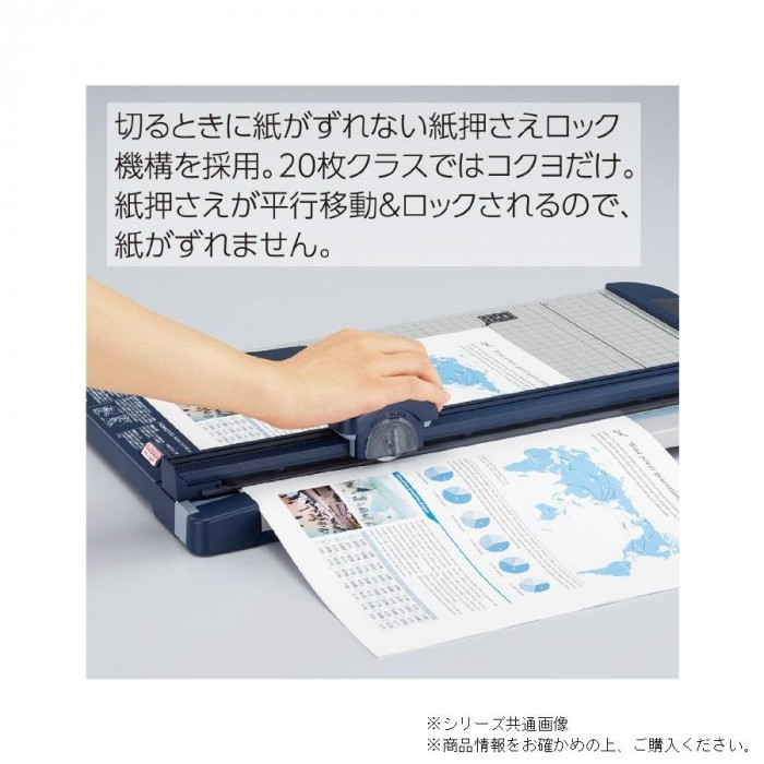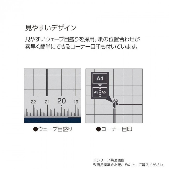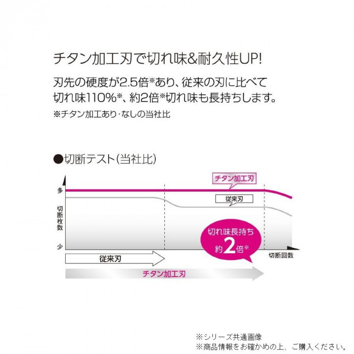 | チタン加工刃搭載で、切れ味持続2倍・切れ味110%・刃先の硬度2.5倍(すべて当社比。チタン加工あり・なしの場合で比較)です。スライダーを前後にスライドするだけで、簡単に裁断ができるロータリー式ペーパーカッターを採用しています。コーナー目印つきなので、半分カットも定型カットも手早く位置合わせできます。 |