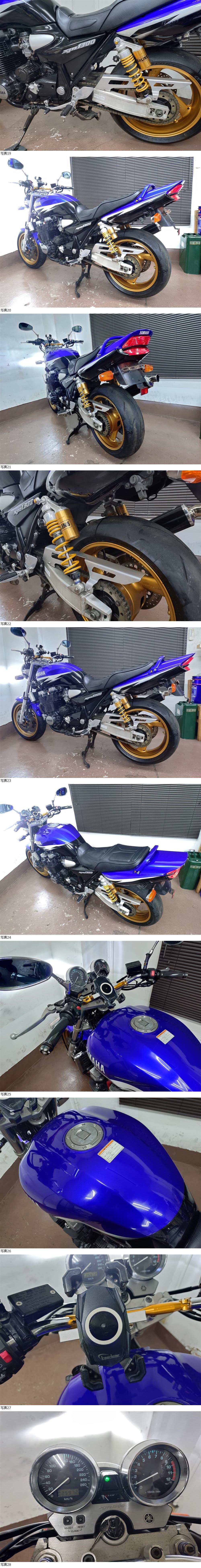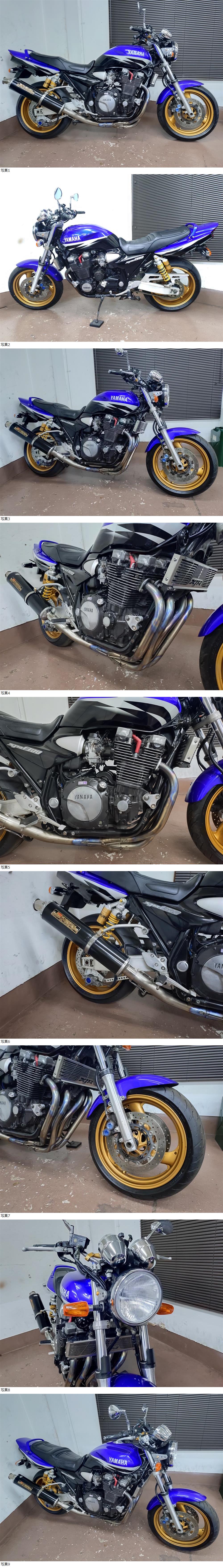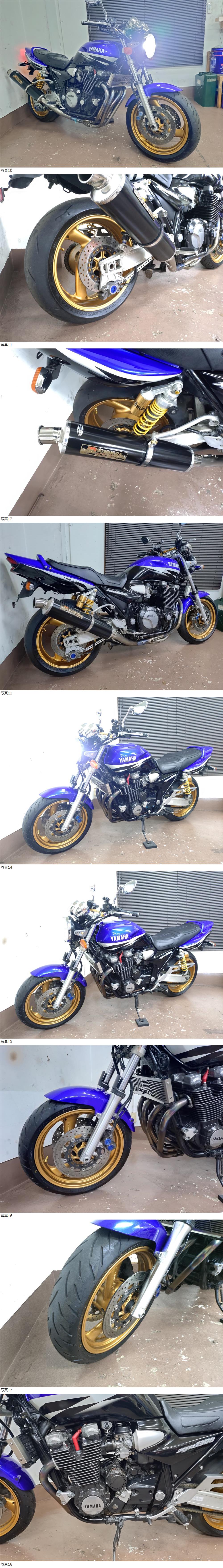 | 商品説明 | ★☆出品車両の拡大画像は文末に掲載しております★☆ アクセス頂き有難うございます。 商品説明文を最後までご熟読頂き、オークションへのご参加およびお取引を、宜しくお願い申し上げます。 -------------------- ●車両基本情報 ・初年度登録年月:平成14年10月 ・型式: BC-RP03J ・車台番号:RP03J-002***(下3桁伏字) ・メーター表示距離:25,972km(表示値) 過去記載距離 25,500km/令和7年 24,400㎞/令和5年 ・キー:純正共通1本+社外スペア1本 ・エンジン始動:○ ・セルまたはキックスタート:○ ・バッテリー残量:○ ●【当方にて『走行テスト』実施済み】 ⇒正常制動・正常ミッション入力ほか確認済み ●保安部品の作動状態 ・ヘッドライトHI/LOW切替:○ ・ウインカー:○ ・ホーン:○ ・テールランプ:○ ・ブレーキランプ前後:○ ●ガソリンタンク内部の状態:目立つような内部サビは特に無し ●エンジンの状態 ・エンジン総合状態:年式/距離相応の状況 (特に大きな問題の無い一般中古車レベル) ⇒気になる際は必ず『現車確認』をお願い致します。 ・オイル漏れ箇所:- ・その他特記事項:顕著なオイル漏れ箇所は特に無し ●足回りの状態 ・ステムベアリングの状態:現状は問題なし ・フロントフォーク:現状オイル漏れ無し/ダストシールひび左右小程度 ・前後タイヤ残量:F 8分山 R 7分山 【フロント・2025年製造品・リヤ:2023年製造品】 ●外装の状態 ・ガソリンタンク凹み:目立つような凹み箇所は特に無し (右横エンブレム部に目立たない程度の浅い小エクボ確認) ・外観全体:基本的に年式相応とお考えください (多数の画像や始動確認動画の通りの一般的な実動中古車です) フォークアウター部小サビ確認 タンクの状態は上記の通り サイレンサーエンブレムキズ+一ブラック塗装あり エンジンペイント剥がれ箇所あり テールカウル左後方キズあり ホイールゴールドペイント施工 タンデムステップ未装着⇒『+付属部品(左右タンデムステップ)あり』 ※ヤマト運輸着払いまたは直接手渡し対応※ その他経年劣化箇所各所にあり ⇒①より詳細把握のための現車確認(※諸条件あり・下記参照※)につきましては、質問欄より打診をお願い申し上げます。 ●その他特記事項: 車検は令和9年3月まで残あり 修復歴無し(JABA管理システム上および当方現車確認による) ●お渡しする書類:あり (自動車検査証+自賠責保険証+譲渡証明書+ナンバープレート) ●その他情報 XJR1300(BC-RP03J)の『人気青ストロボカラー』カスタム車両です。 【車検=R9年3月迄】長く残りがあります。 点検整備ほかの一助としての、下記記載の一部オプション設定がございますので、その手のお時間が無いユーザー様につきましては、ご希望を落札後にご用命くださいませ。 ※原則、下記オプション以外の内容の承りは出来ません※ 前後タイヤは上記の通りに、フロント側は『ほぼバリ山』+リヤ側も未だ十分に残がございますので、即時交換の必要は無いかと考えます。 銘柄は各々、F側ダンロップGPR300/R側ダンロップα-14となりますので、情報追記しておきます。 現状、走る・曲がる・止まるという二輪車に於ける基本三要素につきましては、特に問題無く機能保持されています。 その他、下記内容の比較的魅力と考えるカスタムが施されております。 《寒い冬真っ只中…》にて今回、『格安出品⇒格安即決設定にての売り切り』です! ぜひご検討をお願い申し上げます。 -------------------- 【注意事項】 始動(確認)動画につきましては当面の間、『当方の考えの下、試験的にアップしない方向』を考えておりますので、その実情は現車確認にてご対応をお願い致します。 ⇒【始動の証明=タコメーター動作画像による客観的証明】 昨今、当オークション取引をはじめとする周辺事情の変化ほかにて、基本的には対面取引を主軸に置く方向としていくための措置となります。 従って、遠方からの取引の方はその特性を十二分にご理解のうえ、それに臨んでください。 -------------------- カスタム箇所は高価なヨシムラチタンサイクロン(おそらくEX部はファイヤースペックと推測します)フルエキマフラー、オイルクーラーカバー、ハンドルブレース、LEDヘッドライトバルブ+その他装備品ほか、ホイールは渋いゴールド仕上げとなっております。 その他、メーターパネルは定番の260㎞/hフルスケール盤に交換されています。 全体的なコンセプト的には、ある程度まとまった内容かと考えます。 その他箇所につきましては、上記にて記載の内容通りとなります。 +車検その他用の【純正タンデムステップ左右】が付属致しますので、決済ご完了以降にヤマト運輸宅急便着払いまたは、直接手渡しにて差し上げます。 陸送その他をご活用の際、(輸送⇒到着)スケジューリングの確認は、ご入札前にユーザー様にて事前にご確認くださいませ。 以上、宜しくお願い申し上げます。 ~【注】現車確認対応の間の出品取消等は行いません~ 格安出品⇒格安早期即決金額設定にて原則、オークション落札が優先とな