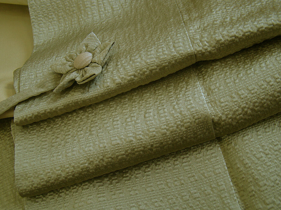 | ちょっと一言 | 柔らかなぽってりとした極上ちりめん地にフクレ織のお洒落な着物姿を奏でる道中着です。 |