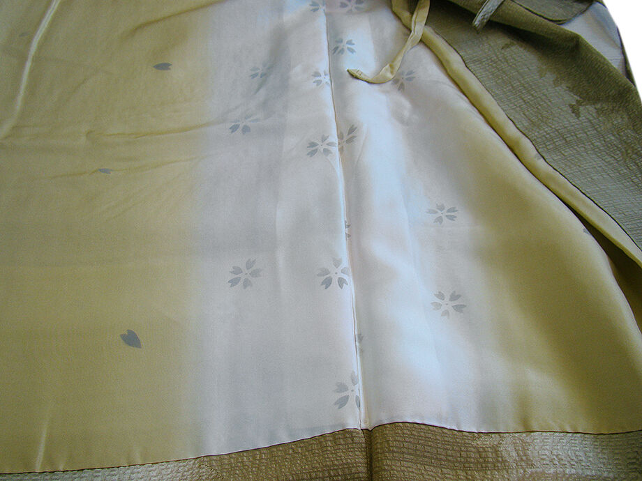 | 商品説明 | とてもしなやかで柔らかなふっくらぽってりとした着心地良い重めの極上ちりめん地の生地。 渋い根岸色地にべージュ色ぼかしにフクレ織。 裏地も正絹。 手縫い仕立て。 |