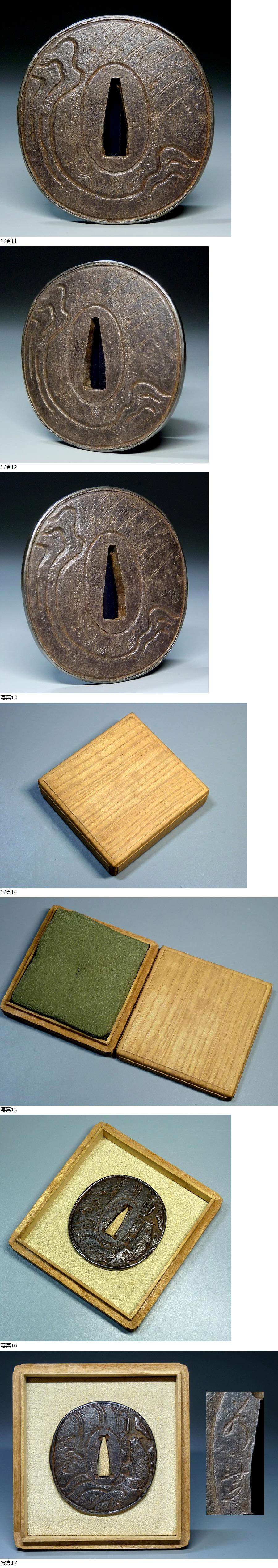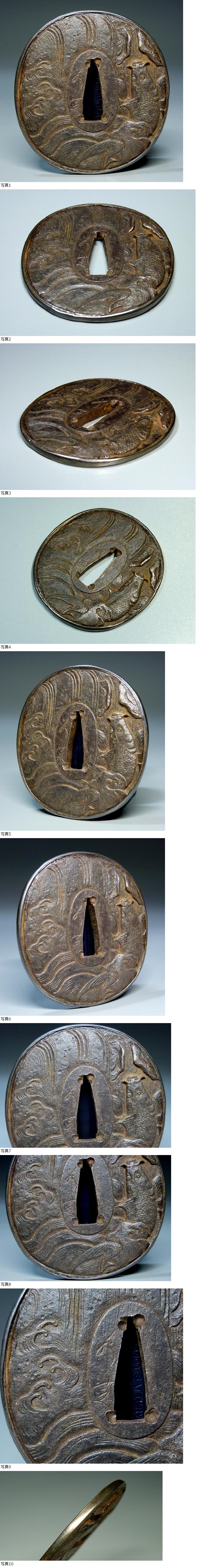 | 【夢たま】肥前 肥後の名鍔!在銘 若芝 刻 銀覆輪 盛上細工 鯉の滝登り図鉄鍔/江戸期 刀剣美術 刀装具☆ サイズ縦約7.2㎝。幅約6.7㎝。厚さ約5㎜。重さ約136g。 【商品説明】:肥前 肥後の名鍔!在銘、若芝刻、銀覆輪、盛上細工鯉の滝登り図鍔の出品です。御覧のような数寄者の ウブ品になります。銀覆輪が施された鯉の滝登り図の良い鍔です。宜しく御願いいたします。 【状態】:経年による薄汚れあり、スレがあり、鉄の変色ありますが、大きな傷みなどもなく、 状態は良好と言えます。時代経過による前記傷みはご了承ください。 |