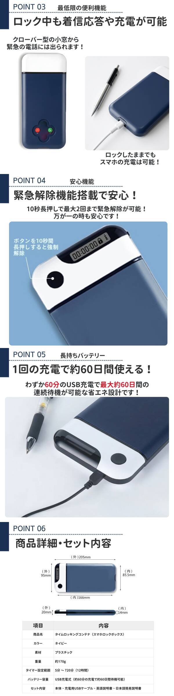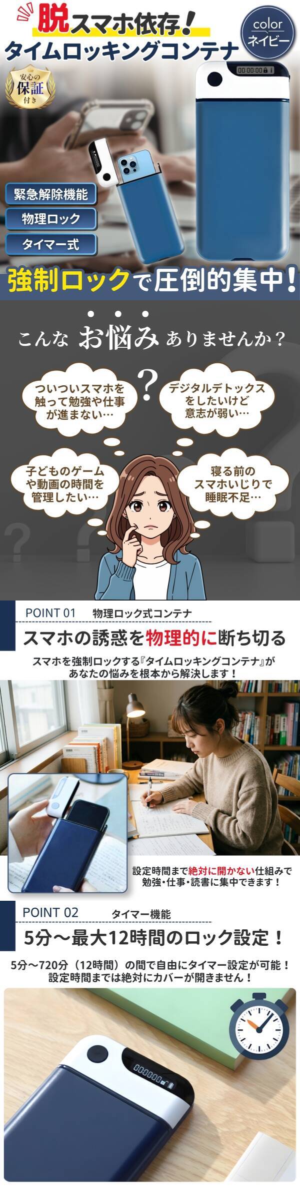 スマホロック タイムロッキングコンテナ ネイビー スマホ依存 対策 デジタルデトックス 勉強 集中力 アップ 子供 受験 睡眠 強制 青 ブルー [浏览原始页面]