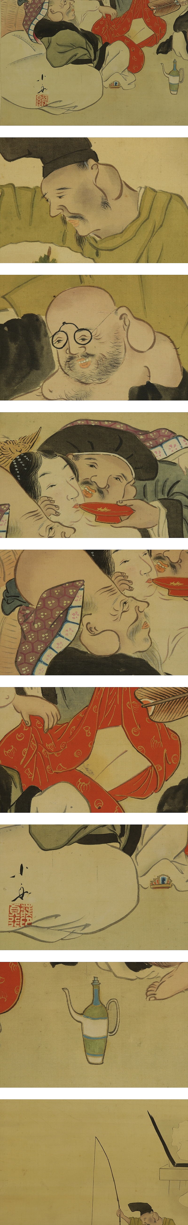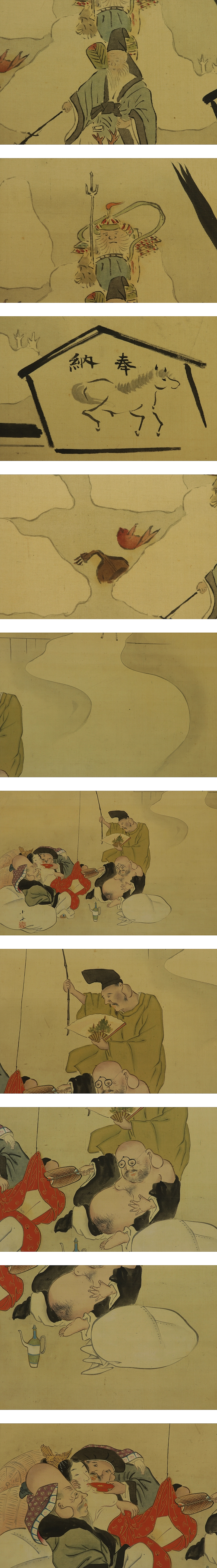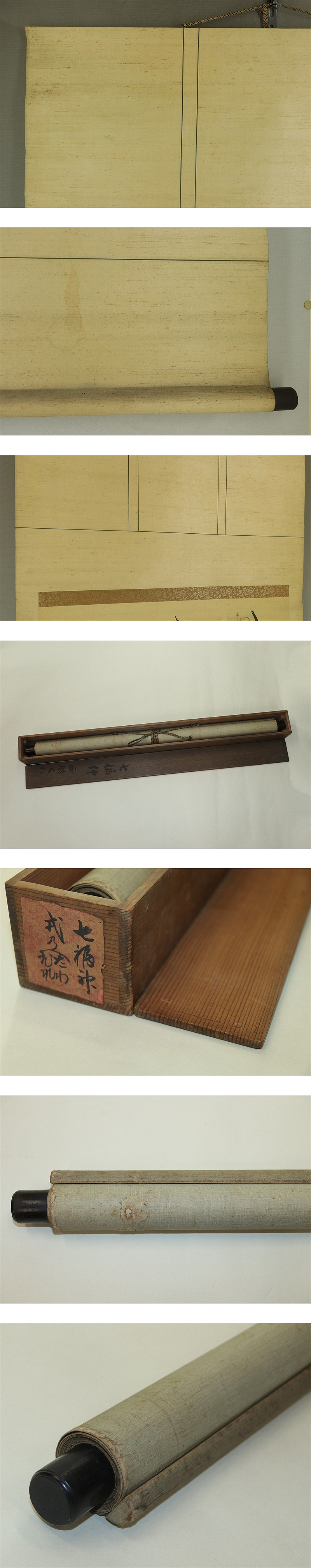 古画 【七福神】 本紙は、染み、汚れ、折れ、皺があります。 表装は、染み、汚れ、折れ、皺、くすみ、ほつれ、破れ、箱に破損があります。 【サイズ】 作品 横約66.5cm×縦約57cm 表装 横約76cm×縦約141.5cm |