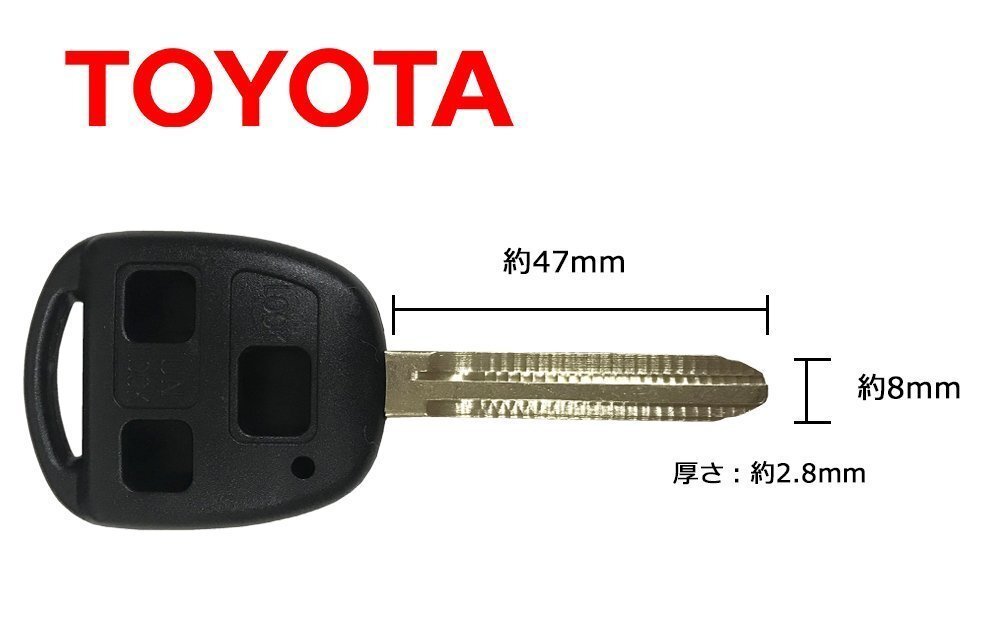 ブランクキーに関しましては、 同年式・同車種でもオプション等により数種類ございますので 車種、年式、型式などからは1種類に特定できず、 お手持ちのマスターキーと【形状、サイズ】を見比べてお客様に 判断して頂く必要がございます。 ![]() ![]() ※こちらの商品はご注文受付後のキャンセル、返品は不可となります。 ※キーナンバーが分からない場合は未カットのブランクキーの発送となりますので、ご注意くださいますようお願い申し上げます。 キーレスのボタンが3ボタン仕様のブランクキーです。 スペアキー、鍵の折れ、割れ、傷汚れ等にお安く改善が可能です。 内部のキーレス送信機は付属致しておりませんので純正のものを流用下さい。 社外品のため、メーカーロゴは入っておりません。 車種や年式で数種類ございます。 当店では車種・年式・車検証では特定できかねますので、 お手元の鍵と販売ページの写真、リモコン部及び鉄のブレード部の形状を見比べて お客様にて判断していただくようお願い申し上げます。 ・ボタン数:3個 ・参考キーナンバー (キーナンバーだけでなく実際の鍵と掲載画像を必ずご確認ください) 10000-15000 / 50000 - 69999 ・参考車種 トヨタ:エスティマ アルファード ノア ヴォクシー シエンタ イプサム ランクル ランクルプラド マークII マークII クオリス 100系ハイエース ラッシュ など ・サイズ(キー部分):長さ:約47mm 幅:約8mm 厚さ:約2.8mm ・当店では車種・年式・車検証で特定できません。 画像のキー形状とカバー形状、サイズをお手元の鍵と比較しご確認ください。 ・イモビが付いている車種は送信機の中に組み込まれていますので、そのまま移植すれば問題なくエンジン始動できます ※ 一部イモビがプラスチック内等に埋め込まれている場合移設・加工が必要です ![]() ■キーナンバー確認方法 ・新車購入ならキーナンバーが書かれたプレート ・キーナンバープレートがない場合は運転席側のドアのシリンダー ・マスターシリンダー などに数字が刻印されています。 上記以外の場合はディーラーなどにお客様ご自身でお問合せ下さい。 ※キーシリンダーの取り外しに自信のない方は整備工場や専門店様にご依頼ください。 ※ディーラーで調べることは可能ですが、別途費用が掛かる場合がございます。 ※取り外したことにより発生した事故・故障・損害は一切保証できませんので、お取り外しは整備工場などで行い、あくまで自己責任の上で取り外しを行ってください。 (作業ミスなどの責任は負いかねます)。 ご注文受付後、キーカットに進みます。 商品の特性上、ご注文受付後はキャンセル・返品など承りかねます。 ご了承のうえご注文をお願い致します。 通常は問題なく純正キーと同様に使用出来ますが、お客様のシリンダー(ドア・イグニッション・トランクなど)の使用状況により、回らない、回転が重いなどの症状が発生する場合がございます。 ![]() ![]() ・当店ではお車への適合の確認や取り付けに関するサポートはおこなっていませんので、お車への適合やご使用方法につきましては専門店さまなどにご相談ください。 ・製造・流通過程(商品同士の擦れ)において商品に多少の擦り傷や汚れ等が発生する場合があります。その点はノークレームでお願いします。 ・当商品はインポート商品の業者様向けの製品(バルク品)のため、メーカー保証書や説明書などは付属していません。 ・梱包は装飾された箱ではなく簡易包装での出荷となります。 |