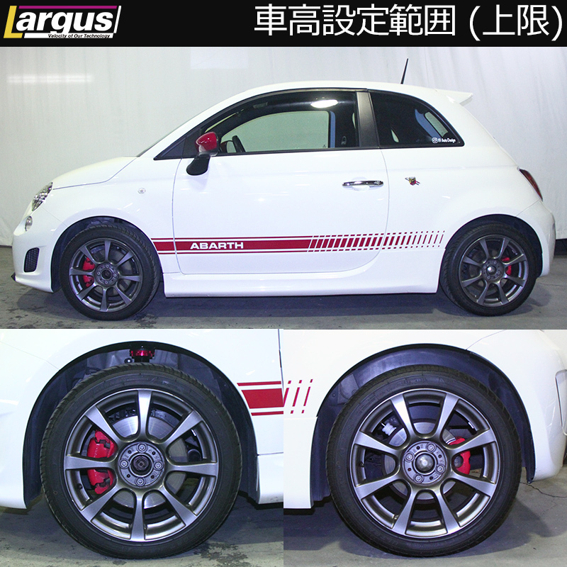 | 備考 | 車高調整範囲とダウン量はABARTH595のデータになります。フロントアッパーマウントの固定方法は純正とは異なり、セレーションボルトを固定するボディ穴はサービスホールを使用します(専用取説あり)。キャンバー角の調整には車高調の取り外しが必要となります。 |