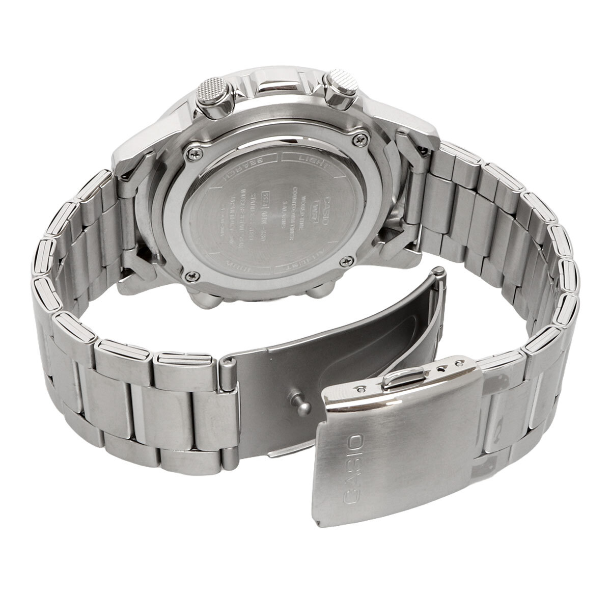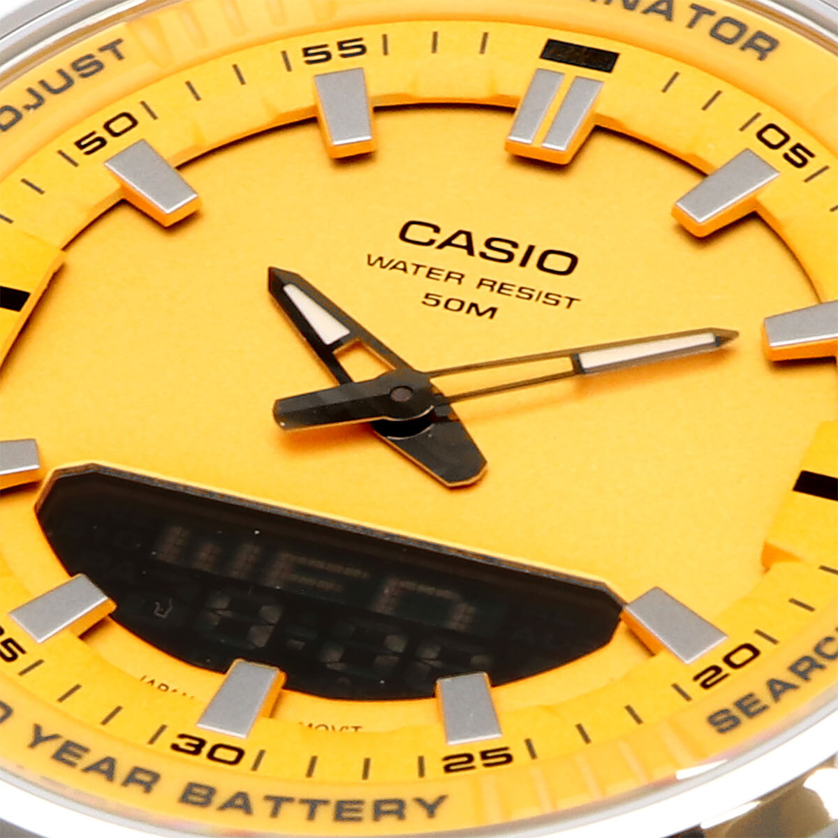 機能 | ●電話番号を最大30件メモリー(名前部:8文字、番号部:16桁) ●ワールドタイム:世界30都市(29タイムゾーン)の時刻表示、サマータイム設定機能付き ●ストップウオッチ(1/100秒、24時間計、スプリット付き) ●タイマー(セット単位:1分、最大セット:24時間、1秒単位で計測) ●時刻アラーム3本(1本のみスヌーズ機能付き)・時報 ●LEDライト(残照機能付き) ●フルオートカレンダー ●12/24時間制表示切替 ●精度:平均月差±30秒 ●電池寿命:約10年(新品の電池に交換した場合) ※時計にあらかじめセットされている電池は、時計製造時に組み込まれている機能や性能をチェックするためのモニター用電池ですので10年未満で切れてしまいます。 |