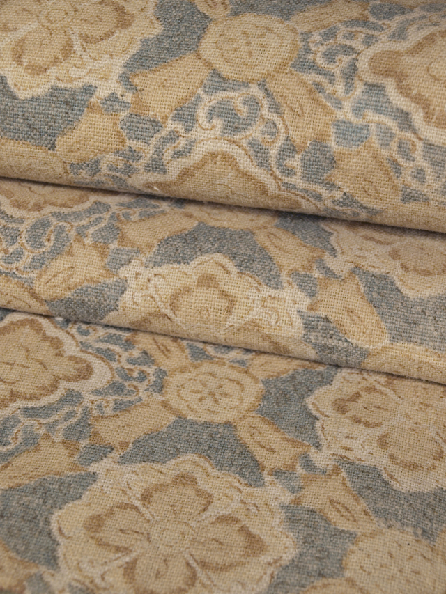 全体的な印象としては、淡い緑青(ろくしょう)色の地に、唐花草でかたどられた襷の文様が染められている、綿の和更紗のはぎれです。 江戸末期ごろにつくられたと思われるアンティークのお品です。ざっくりとした手ざわりの太い糸味がアンティークならではの良い趣を醸しています。 画像のとおり、全体的に褪色しており、端部、耳部と比較すると色差があります。また、上端から約 23cm の左耳寄りに、長さ約 10cm のごくうっすらとしたうすじみが 1 か所ありますが、柄にもまぎれ、ほとんど判別はつきません。そのほかに目につく大きなしみやよごれ、褪色、穴などのダメージはなく、この時代のものとしては良好な状態です。生地の力もあります。 |