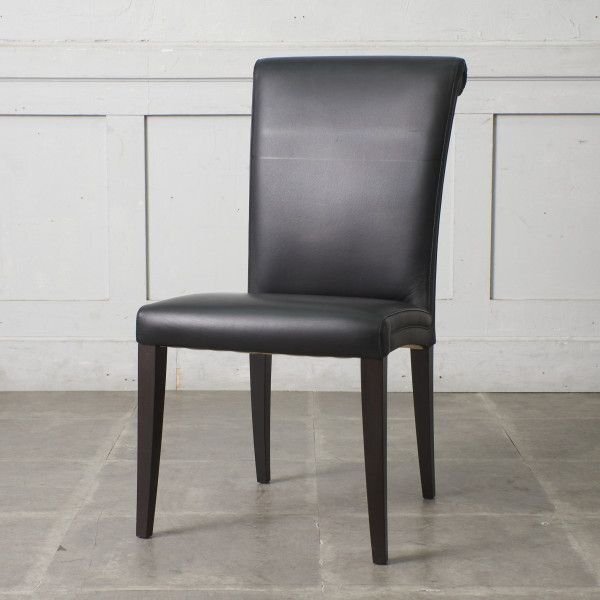 良質なレザーを使ったモダンスタイルのダイニングチェア。背もたれのデザインが特徴的で、中心に向かって渦を巻くように織り込まれたレザーとパイピングによる縁取りで仕上げられている、大人気のチェアです。
