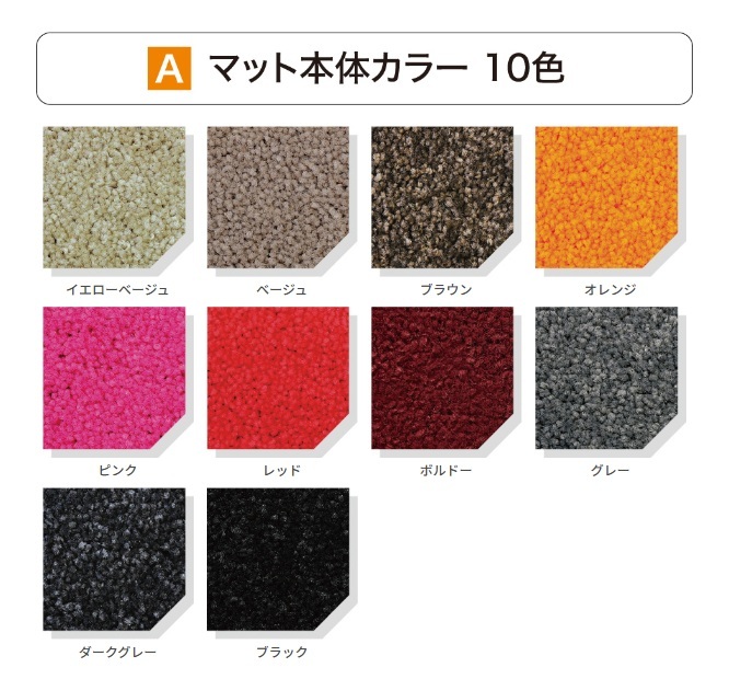 | ■マット本体カラー | イエローベージュ/ベージュ/ブラウン/オレンジ/ピンク/レッド/グレー/ダークグレー/ブラック/ボルドー |
