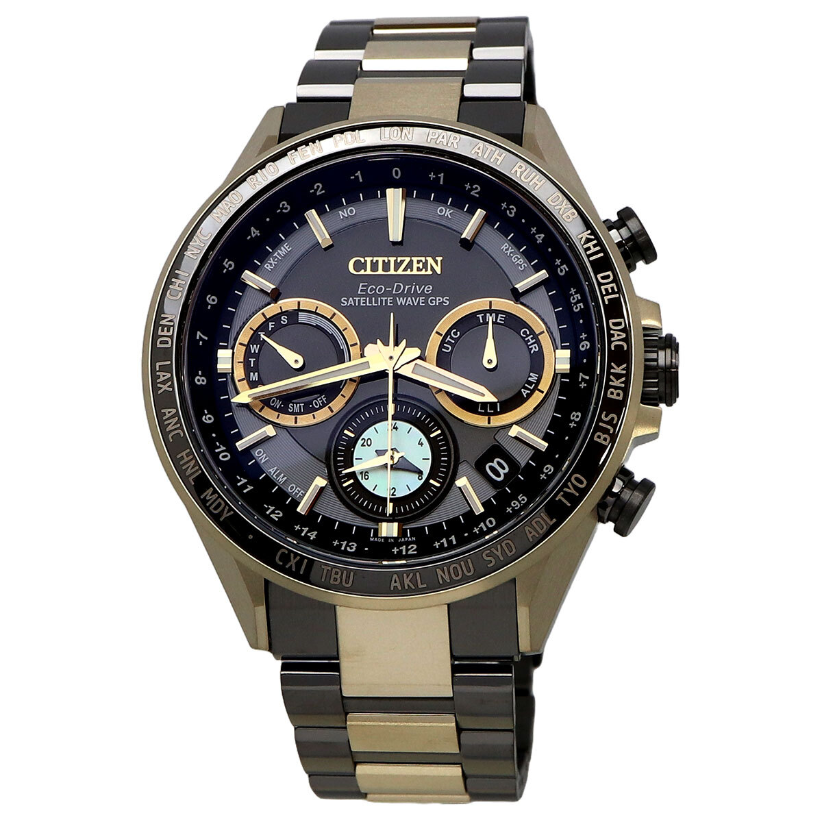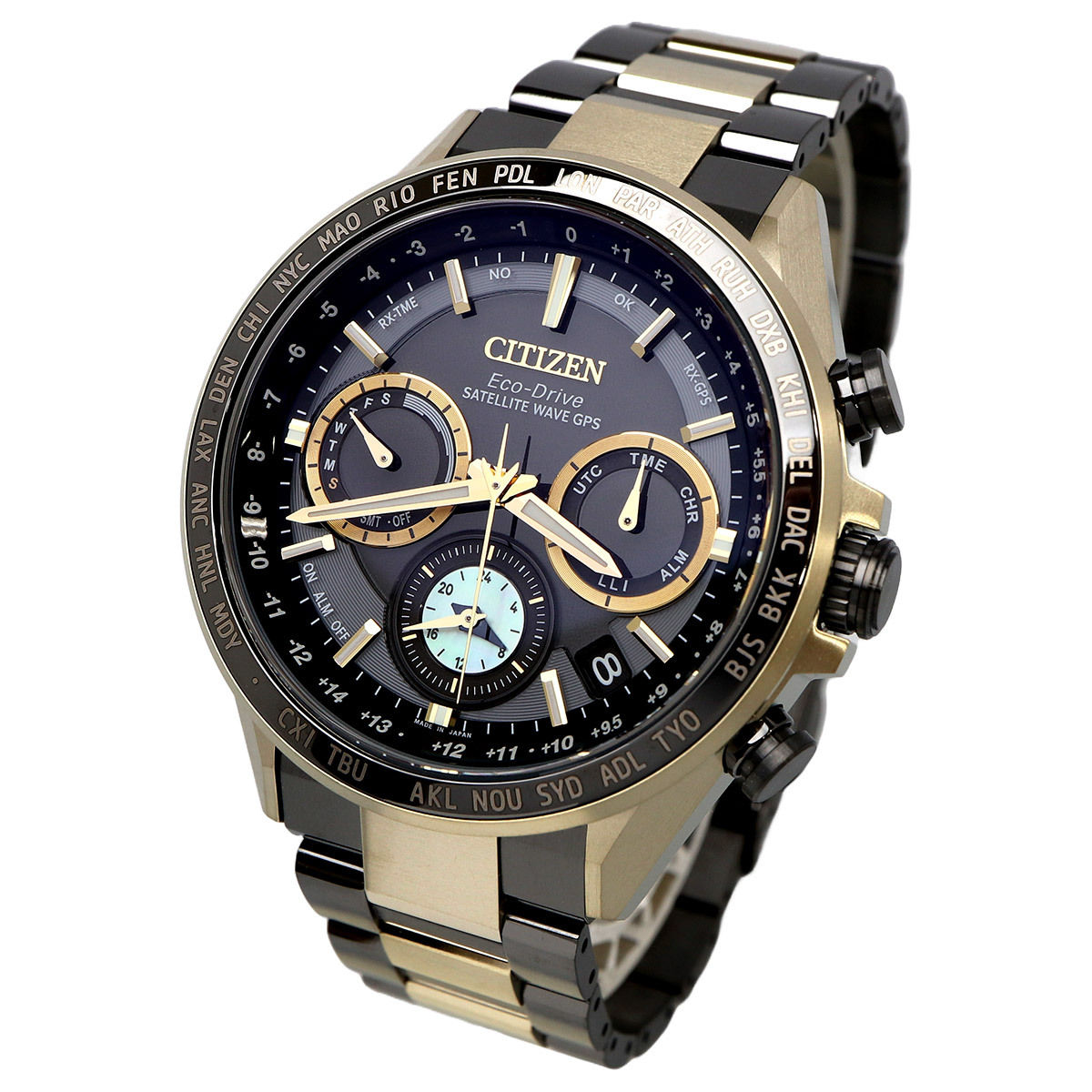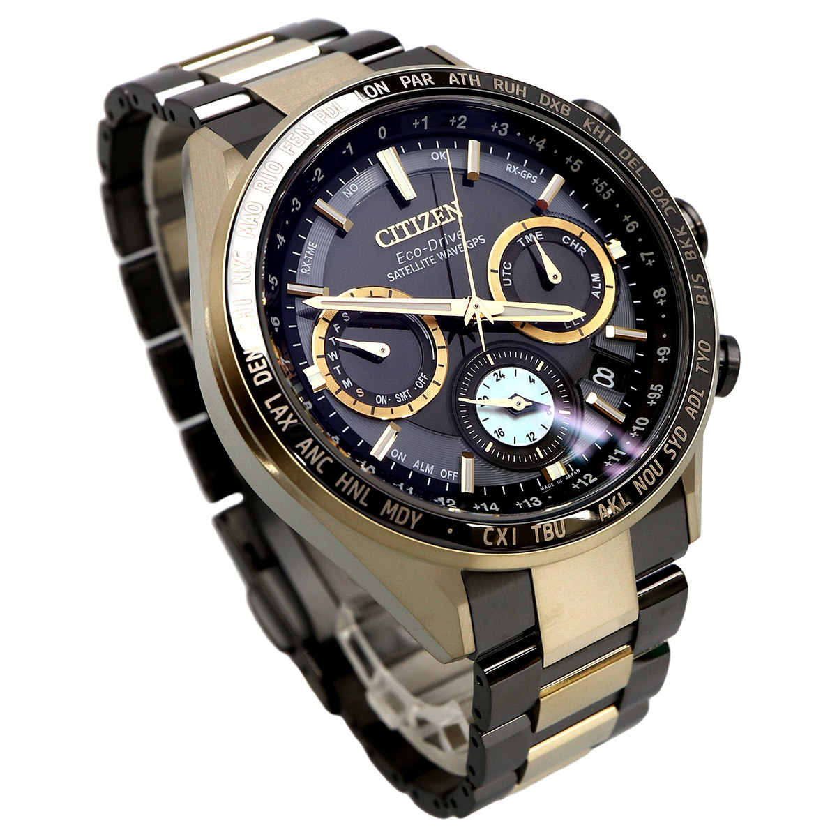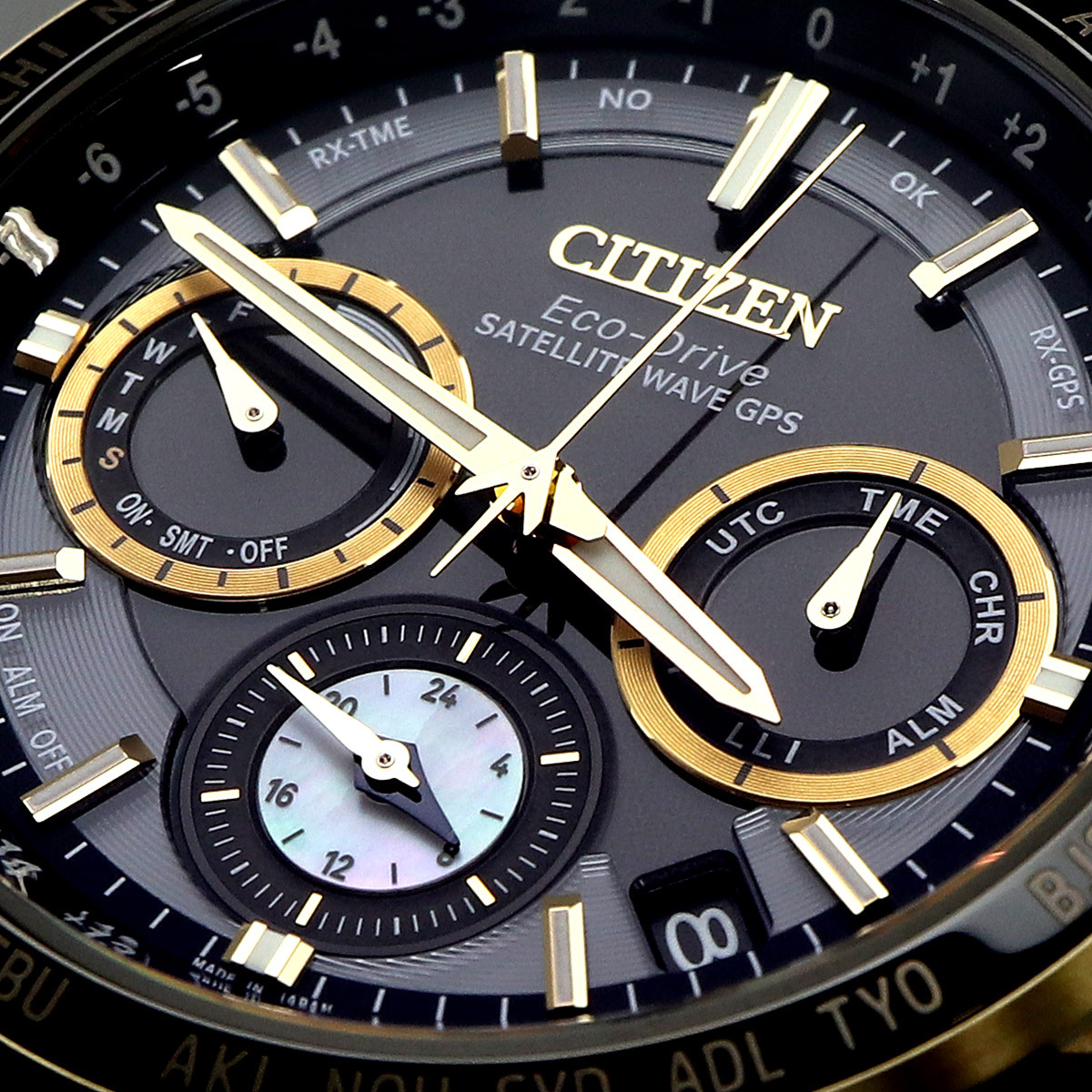 機能 | 充電量表示機能、充電警告機能、充電禁止温度検出機能、過充電防止機能、過放電検出機能、パワーセーブ機能、秒針停止機能、ライトレベル インディケーター、フル充電時約5年可動(パワーセーブ作動時)、衛星電波受信機能、位置情報取得機能、パーペチュアルカレンダー、デイ&デイト表示、1/20秒クロノグラフ(24時間計)、ダブルダイレクトフライト、ワールドタイム(39時差)、協定世界時(UTC)表示、サマータイム機能、デュアルタイム、ホーム/ローカルタイム切替機能、パーフェックス(JIS1種耐磁、衝撃検知機能、針自動補正機能)、アラーム | |||||||||||||||||