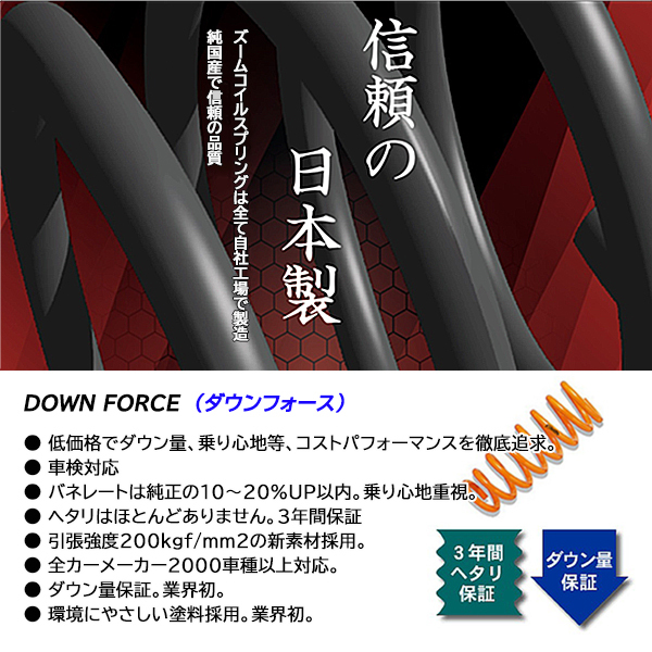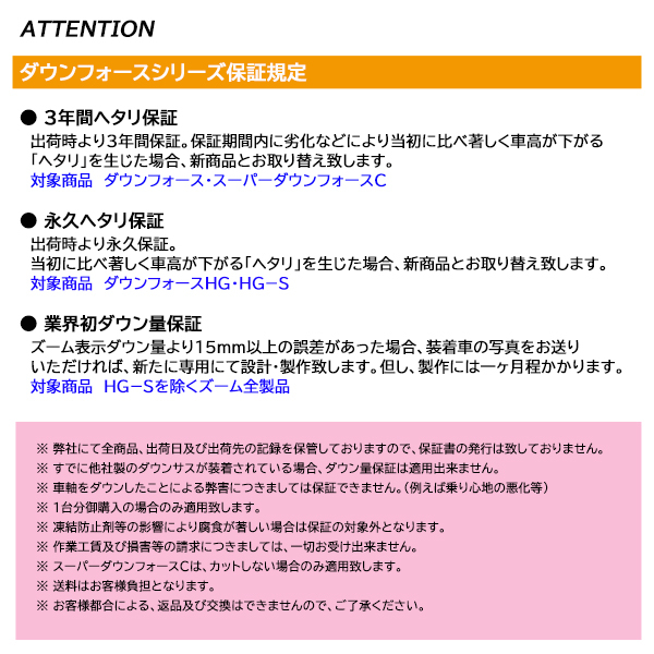 | 車輌への 取付け | ■取付けは、専門知識を有する専門店様にて行ってください。 ■ダウン幅は、参考数値データとなります。 (車輌状況や個体差等により、ダウン幅は変動する為、現車からのダウン幅をお約束する数値ではございませんので、予めご了承ください) | |||