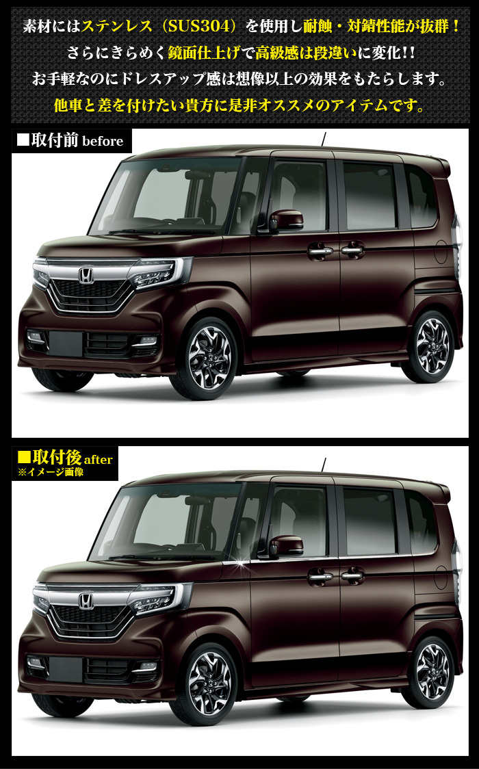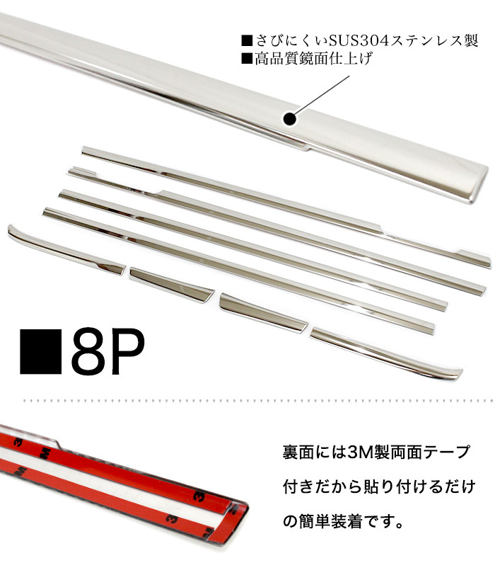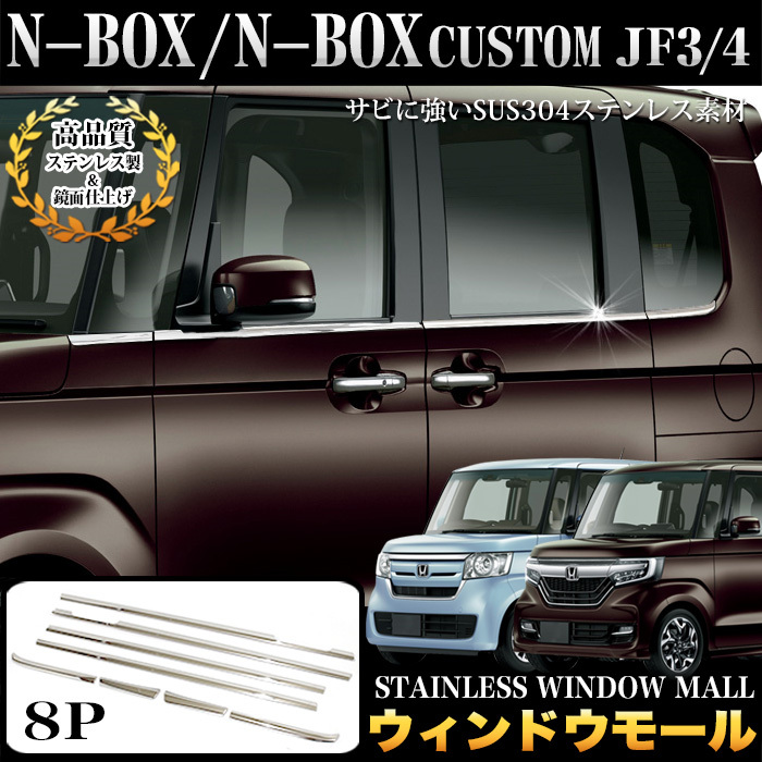 | 車種専用設計で取付け楽々! 煌めく鏡面の輝きがラグジュアリーかつ高級感を演出。 ドレスアップ効果抜群のアイテムです! ■適合:N-BOX / N-BOXカスタム JF3/JF4系 ■年式:H29年9月〜 ■サビに強いSUS304ステンレス製 ■表面パフ仕上げで煌めき抜群の鏡面仕上げ ■3D立体プレス成型品 ■両面テープ装着済み ■セット内容:ウィンドウモール 8P |