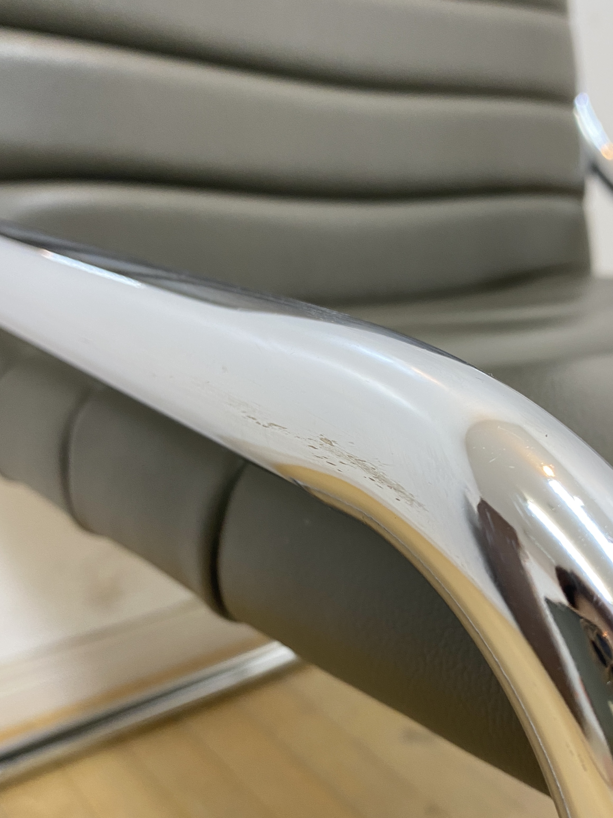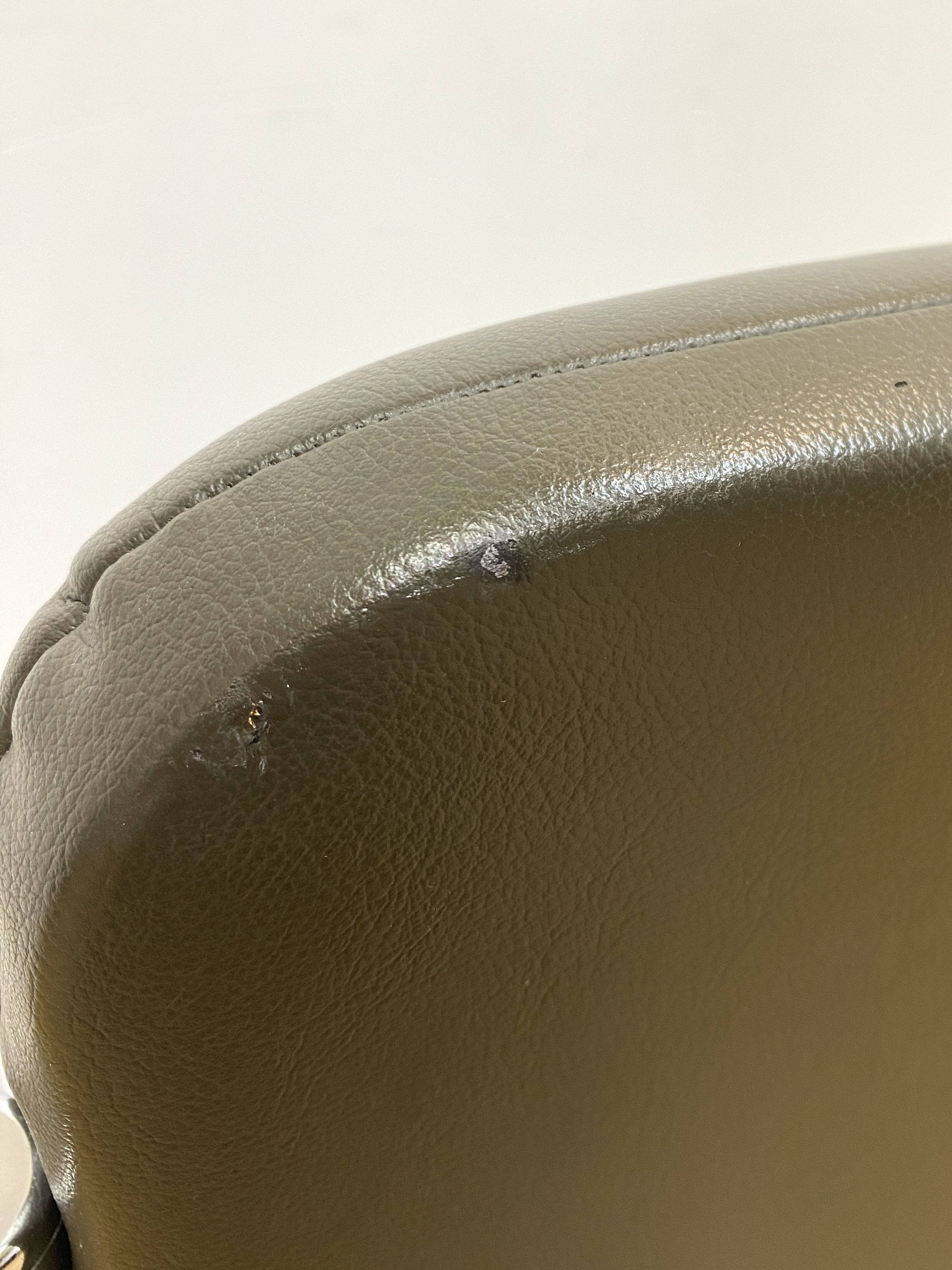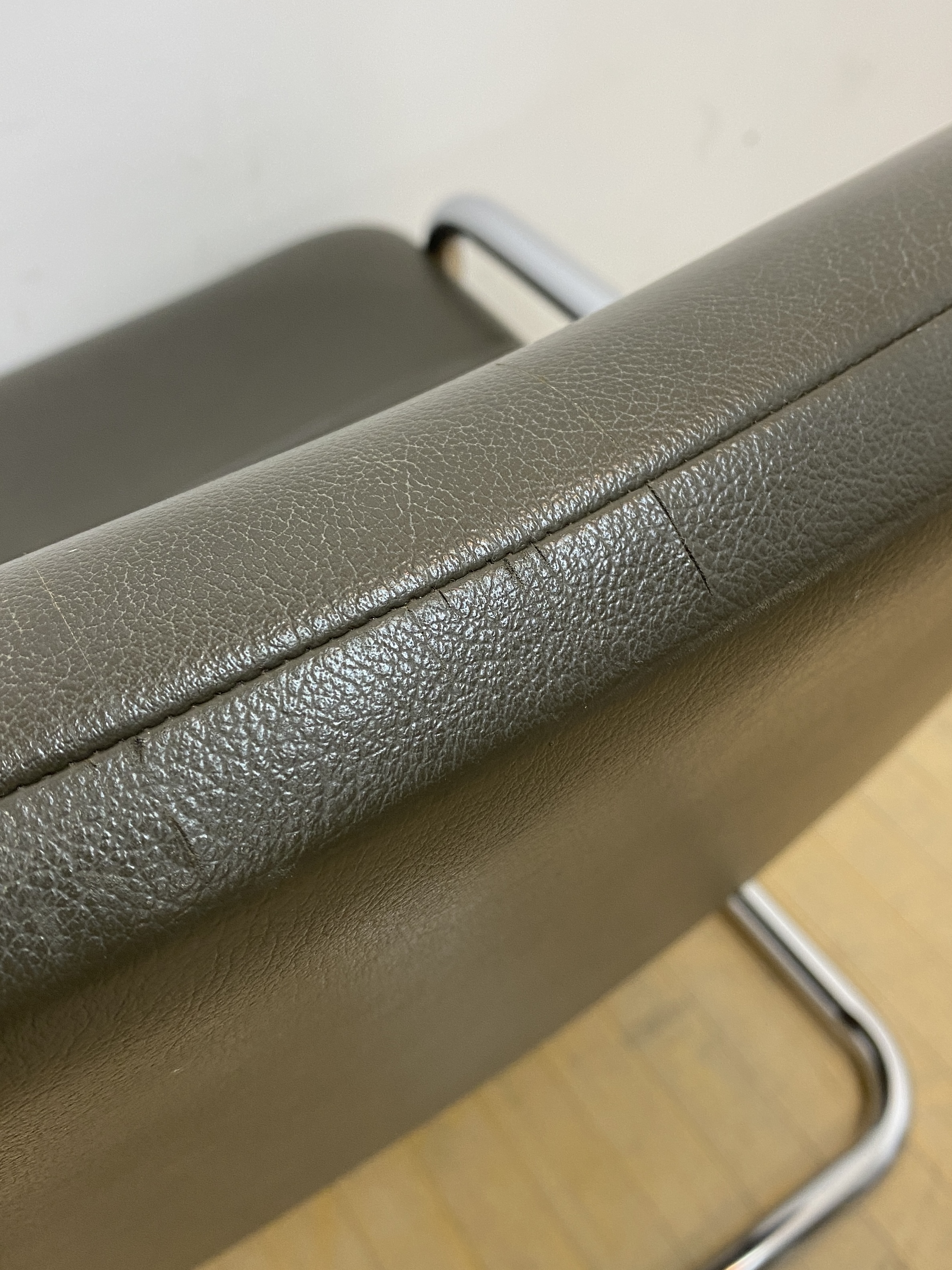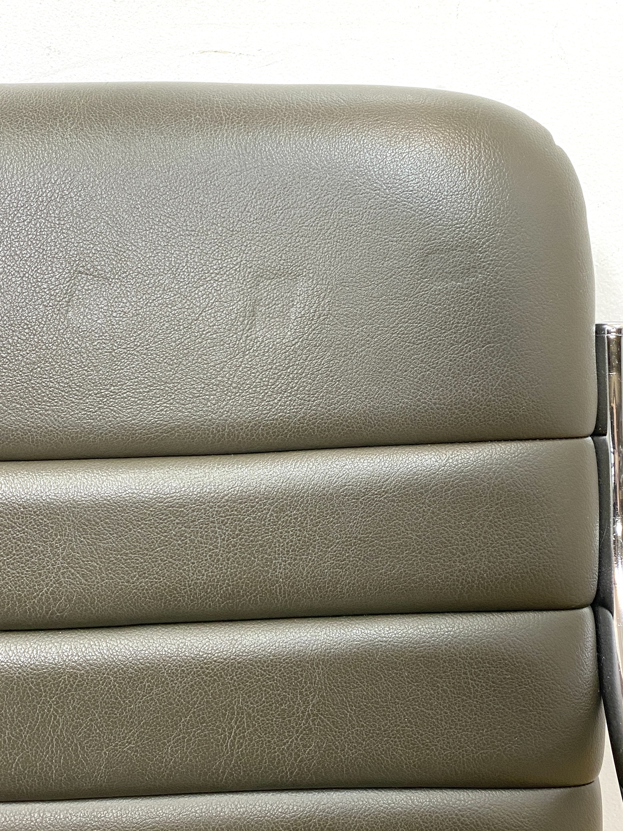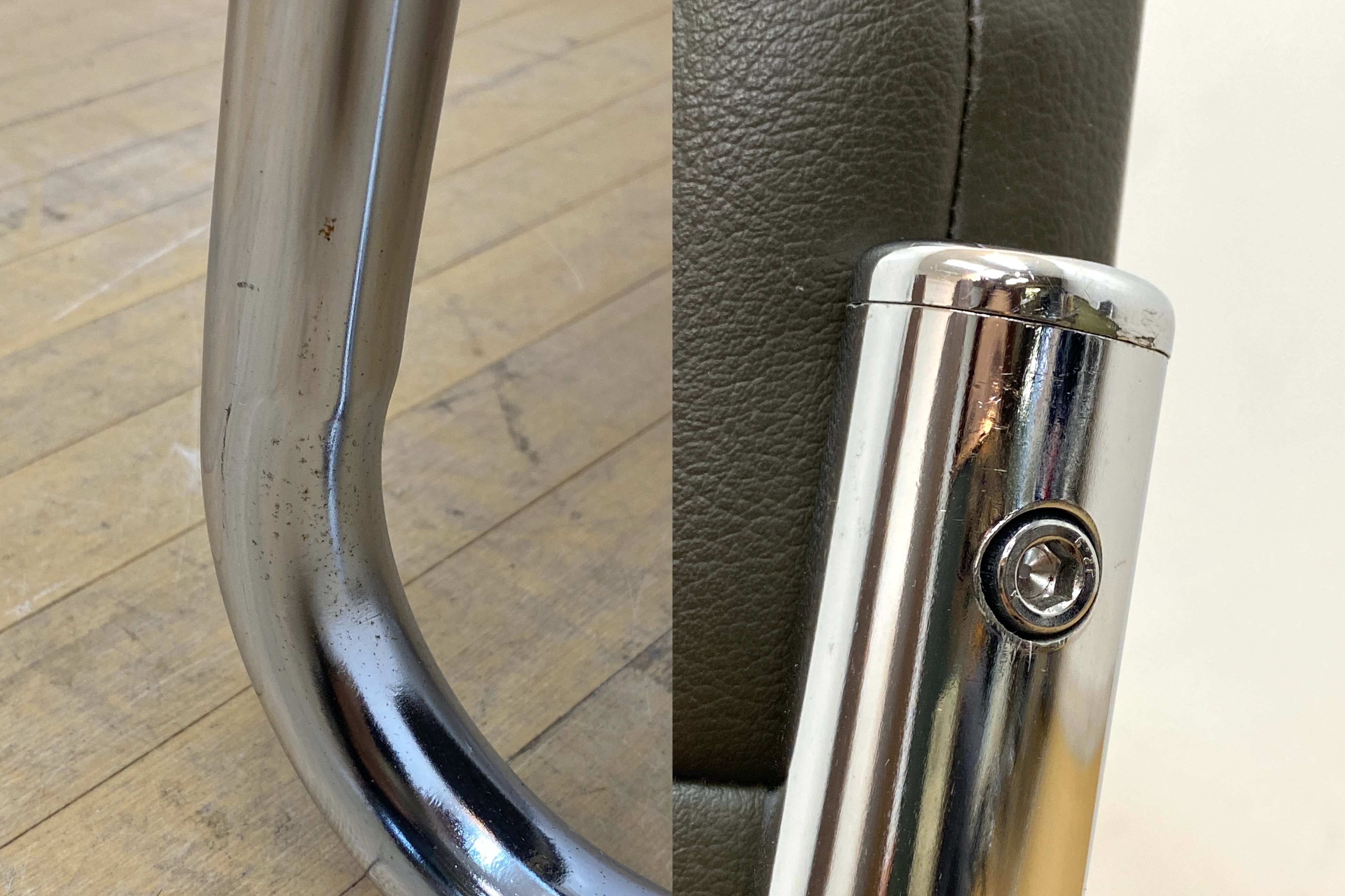 こちらはビンテージのカンチレバーチェアです。 中古品です。 金属フレームにカーキブラウンのビニールレザーの座面を合わせた、 ビンテージのカンチレバーチェアのご紹介です。 背もたれから脚に掛けて、一本のフレームで作られたカンチレバータイプで、 すっきりとしたシルエットがモダンでスタイリッシュなデザイン。 カンチレバー構造による独特の弾力が快適な座り心地です。 ビニールレザーを使用しているため手入れも簡単で、ダイニングチェアとしてもおすすめです。 インダストリアルやミッドセンチュリーといったインテリアとも高相性で、 スタイリッシュな空間づくりにぴったりです。今回、同デザインのチェアが合わせて3脚入荷しています。 ダイニングスペースで使ったり、並べてベンチのように配置しても良さそうです。 セットで揃えていただくことで、空間にまとまりが出るのでおすすめです。 順次出品中ですので、こちらもぜひご検討ください(’25/9/10現在)。 【コンディションについて】 フレーム全体に薄いキズやくすみがあります。背もたれ内側に跡が付いています。 画像では分かりやすいように光を調整していますが、大きく目立つような凹みではありません。 このほか、背面に小さく破れている部分と線状のキズがあります。 使用感はありますが、程よく使い込まれた感じが心地良いビンテージらしい1脚となっています。 他詳細については下記画像も併せてご参照ください。 ![]() 【背もたれの凹み】 ![]() ![]() 【線状のキズ】 ![]() ![]() この機会に是非ご検討ください。皆様のご入札をお待ちしております! 再良市場の他のお品物はこちらから!