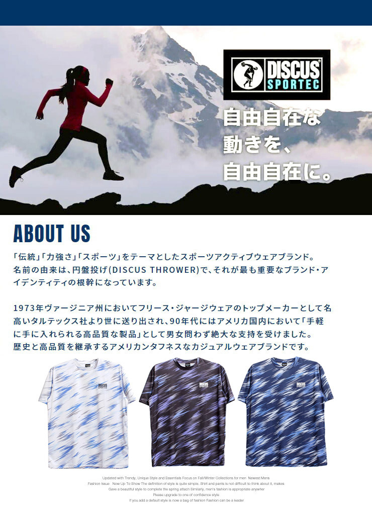 | 商品説明 | DISCUSより暑い時季におすすめの汗を吸ってもすぐに乾かすメッシュ素材を使用した、吸汗速乾性のあるドライ機能付き総柄プリントTシャツが入荷しました。 |