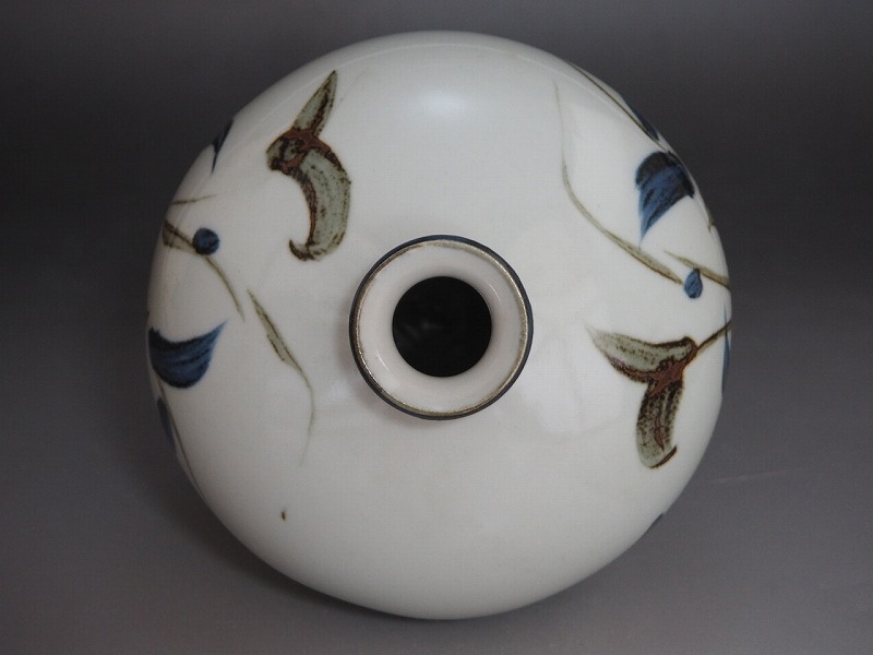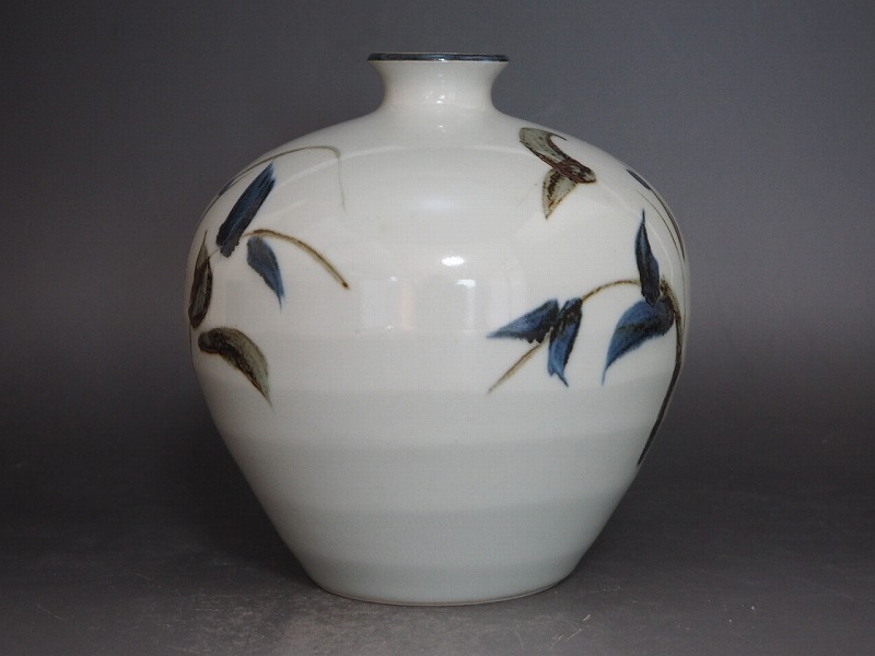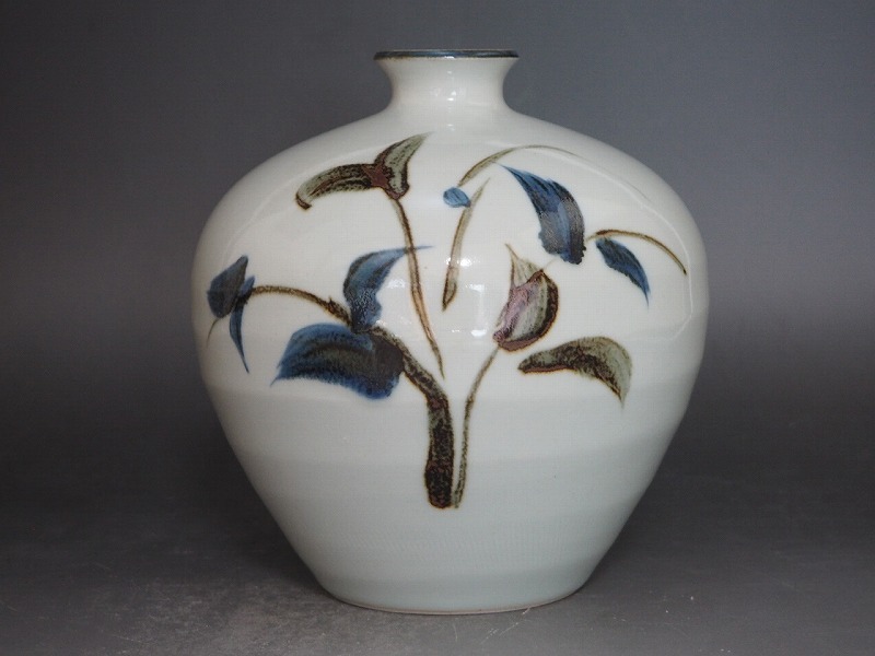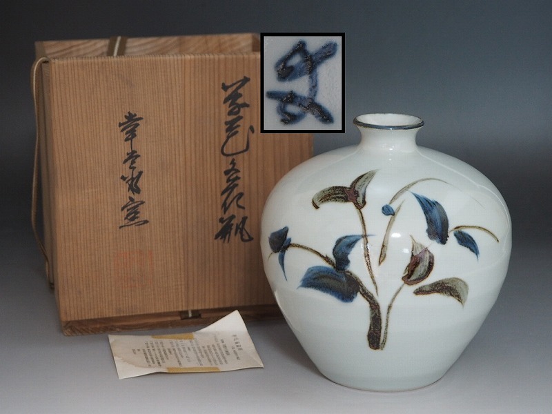 | B1928 幸兵衛窯 造 草花紋花瓶 共箱付 ☆ 華道具 花道具 茶道具 花器 花瓶 花入 花生 花活 飾壷 飾壺 陶器 在銘 陶印 窯印 美品 良品 無傷 | ||