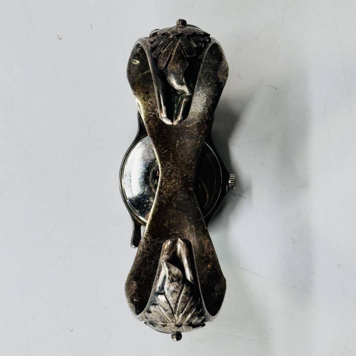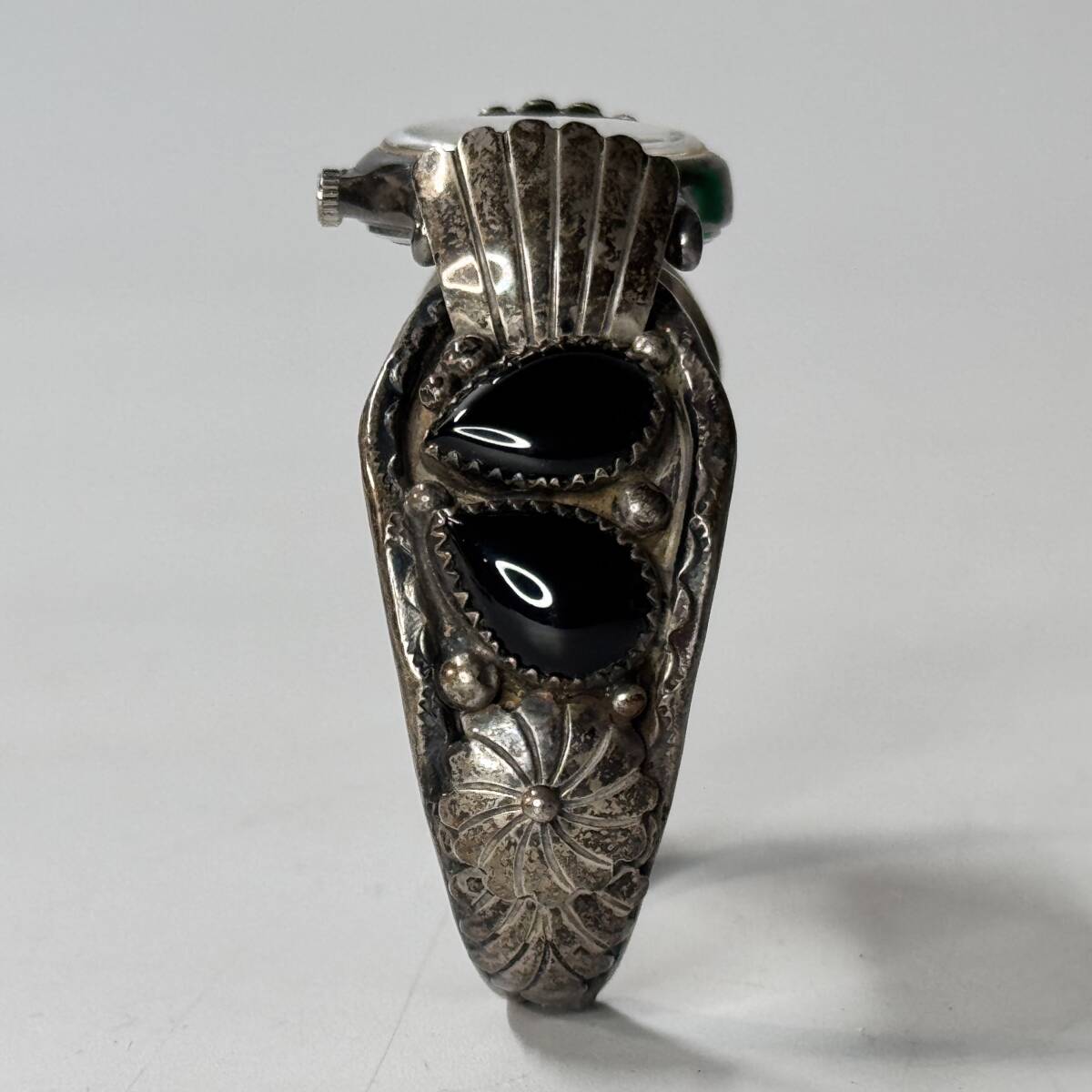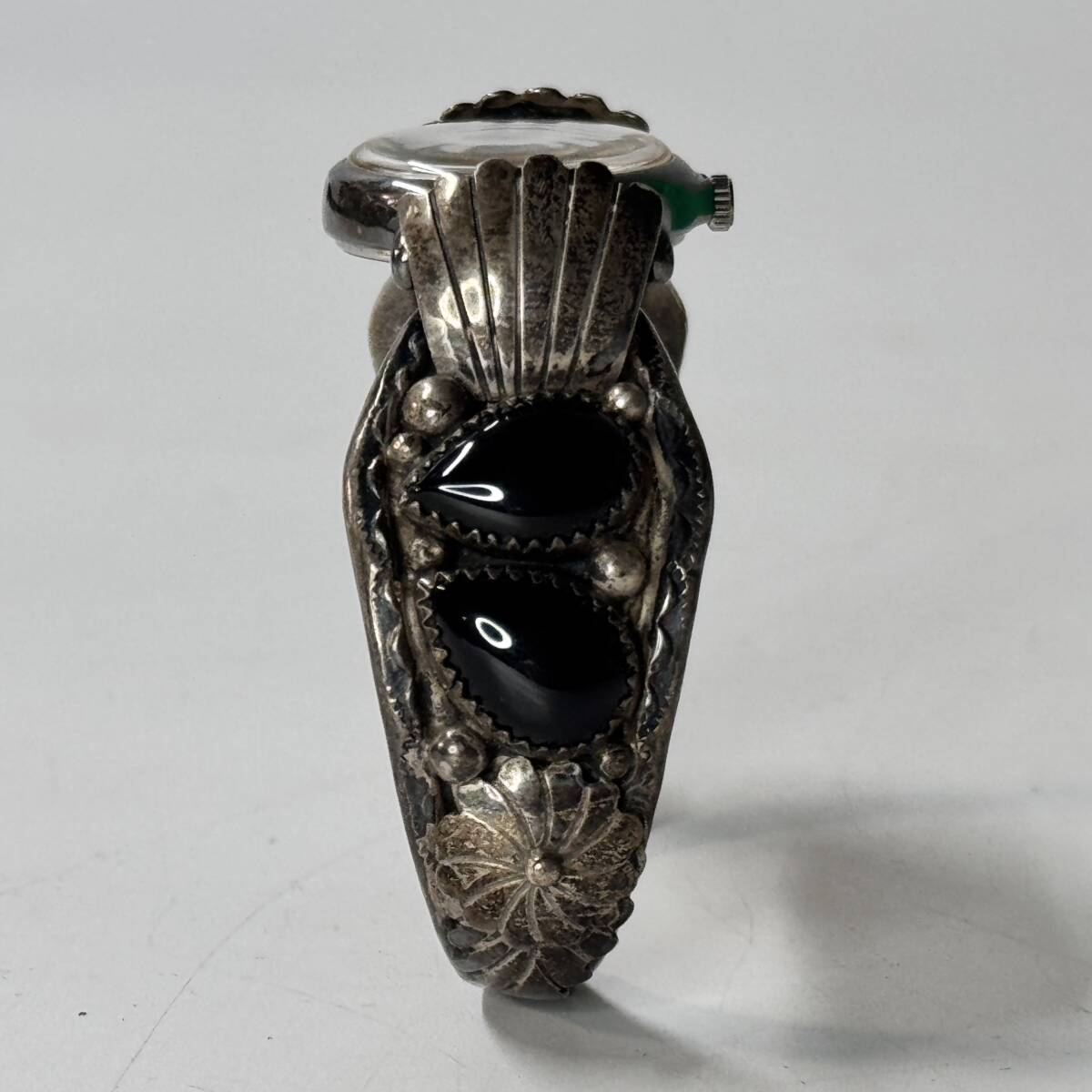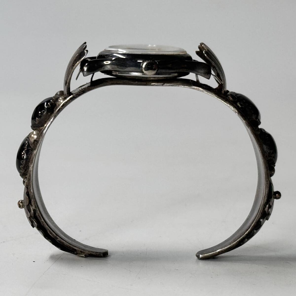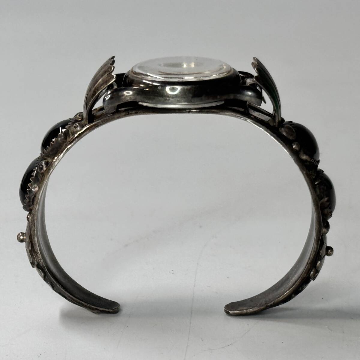 インデアンジュエリーのブレスレットに装着されているため、裏蓋の状態は確認しておりませんが、クリアシールが貼られているのが見えます。