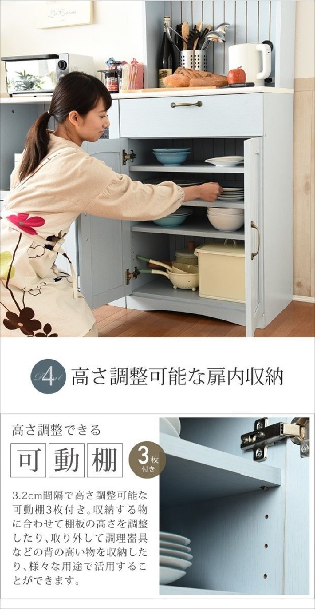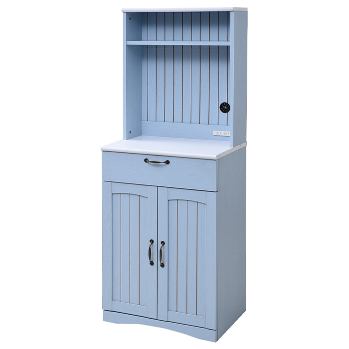 | バイカラーで魅せるフレンチカントリースタイルのカップボード。 コンパクトサイズなので一人暮らしにも最適。 オープン部は2口コンセント付だから、トースターなどの調理家電の収納に便利。 上段には、可動棚があるので、調味料などの小物収納に最適。 下段は、引き出しと扉収納で、カトラリーから食器類をしっかり収納出来ます。 丸みを帯びたフォルムと、アンティーク調の取っ手といったディテールがカントリーテイストを漂わせます。 |