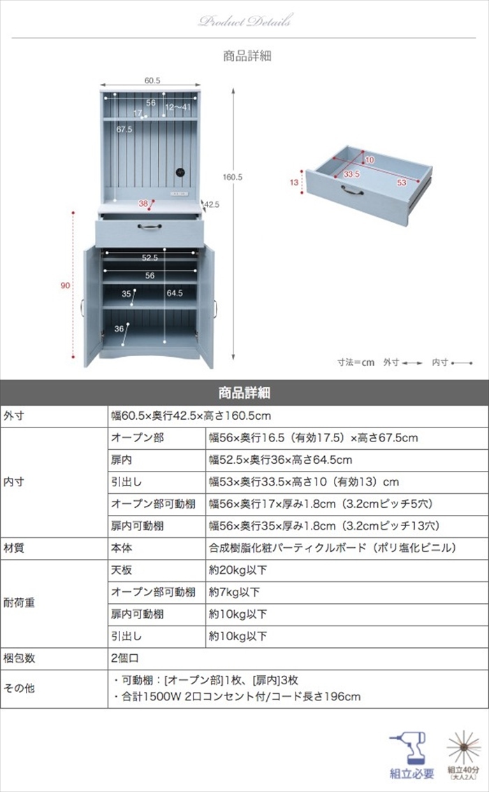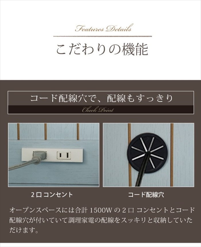 | ・可動棚:[オープン部]1枚、[扉内]3枚 ・合計1500W2口コンセント付/コード長さ196cm |