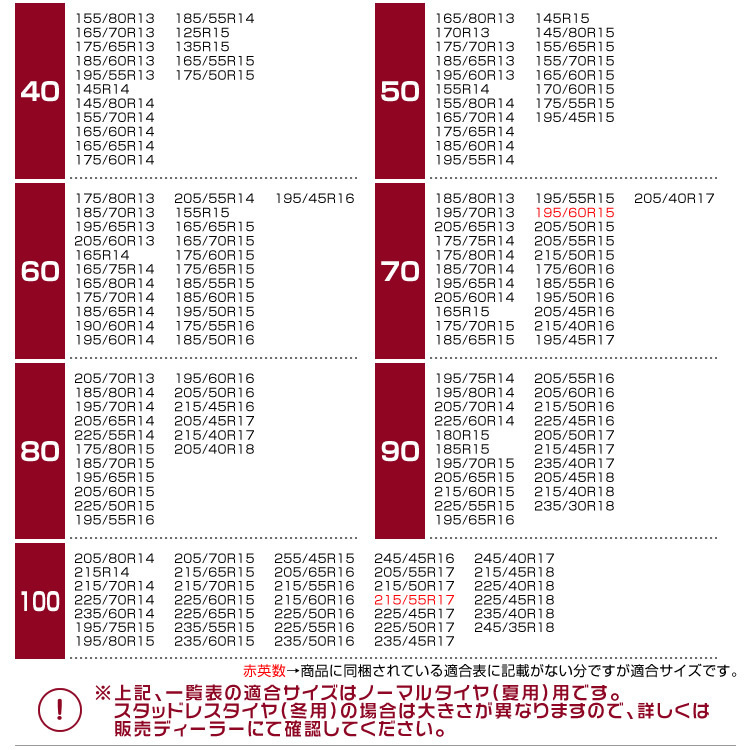 ※扁平率が書いてない場合は「80」になります。 7日間 ※タイヤチェーンは、タイヤサイズに適合するサイズのものを装着してください。 | ||