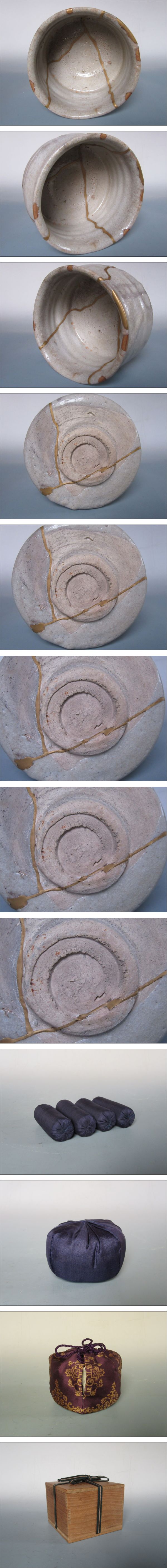 | 商品説明 | *品名: 桃山時代 絵志野桧垣文茶碗 *寸法: 口径約11.4~11.8cm / 高さ約7.8~8.1cm *状態: 金継、共直し(呼継ぎではありません) *附属 : 桐箱、仕覆、中込、柱 ・商品の簡単な説明 桃山時代、伝世、絵志野桧垣文茶碗です。瀬戸黒と器形の良く似た初期の志野茶碗で す。三片に割れた陶片が一碗に金継ぎ共直しされています。 完好状態の伝世絵志野のお茶碗でお茶を頂ける機会はそう多くはないと思います。 例え、直しのものでも普段使いのお茶碗としてお茶を点てられる喜びはひとしお でしょう。このお茶碗で至福のひと時をお楽しみください。 皆様どうぞよろしくお願いいたします。 |
